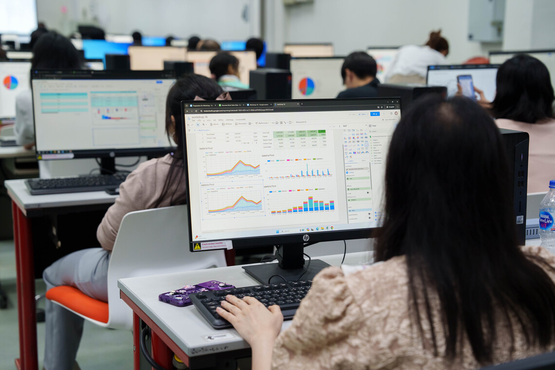 วันที่ 12 มิถุนายน 2567 คณะเทคโนโลยีสารสนเทศและการสื่อสาร มหาวิทยาลัยมหิดล (ICT Mahidol) จัดโครงการอบรมเชิงปฏิบัติการหลักสูตร “Unlocking Data Insight: Looker Studio 101 workshop” โดยได้รับเกียรติจาก ดร. ทิพาจินต์ ไทยพิสุทธิกุล ผู้ช่วยคณบดีฝ่ายบริการวิชาการและถ่ายทอดเทคโนโลยี ให้การต้อนรับผู้เข้าร่วมสัมมนา พร้อมด้วย คุณจิระศักดิ์ จิราธิวัฒน์ ผู้บริหารและผู้ร่วมก่อตั้ง ยิ้ม แพลตฟอร์ม เป็นวิทยากรให้ความรู้เกี่ยวกับการใช้โปรแกรม Google Looker Studio ให้แก่ผู้สนใจ จำนวน 65 คน ณ ห้องปฏิบัติการคอมพิวเตอร์ IT103 ชั้น 1 คณะ ICT มหาวิทยาลัยมหิดล ศาลายา