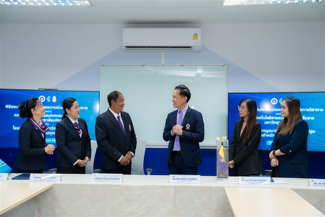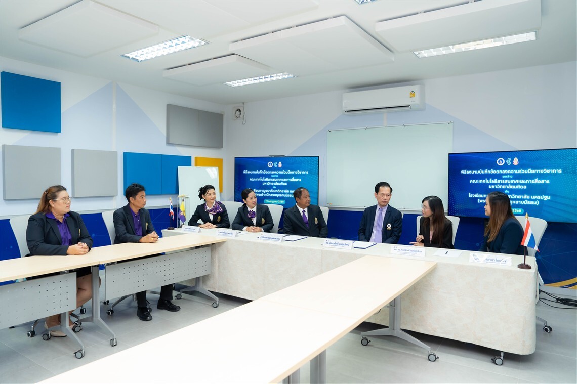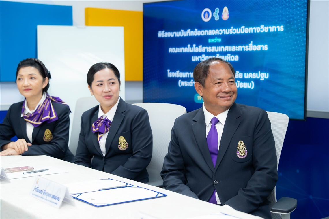 วันที่ 19 กรกฎาคม 2568 ดร.พัฒนศักดิ์ มงคลวัฒน์ คณบดี คณะเทคโนโลยีสารสนเทศและการสื่อสาร มหาวิทยาลัยมหิดล (ICT Mahidol) ร่วมลงนามบันทึกข้อตกลงความร่วมมือทางวิชาการ (MoU) กับ ว่าที่ร้อยตรี พิษณุพล แตงอ่อน ผู้อำนวยการโรงเรียนกาญจนาภิเษกวิทยาลัย นครปฐม (พระตำหนักสวนกุหลาบมัธยม) โดยมี ผศ.ดร.ทิพาจินต์ ไทยพิสุทธิกุล ผู้ช่วยคณบดีฝ่ายบริการวิชาการและถ่ายทอดเทคโนโลยี และ ผศ.ดร.จิดาภา ไกรสังข์ ผู้ช่วยคณบดีฝ่ายพัฒนาหลักสูตร คณะ ICT พร้อมด้วย อาจารย์เพ็ญนภา พลับฉิม รองผู้อำนวยการ กลุ่มบริหารวิชาการ ดร.กมลชนก ภาคภูมิ หัวหน้ากลุ่มบริหารวิชาการ และคณะครูของโรงเรียนฯ ร่วมเป็นสักขีพยาน ณ ห้อง A2 คณะ ICT มหาวิทยาลัยมหิดล ศาลายา