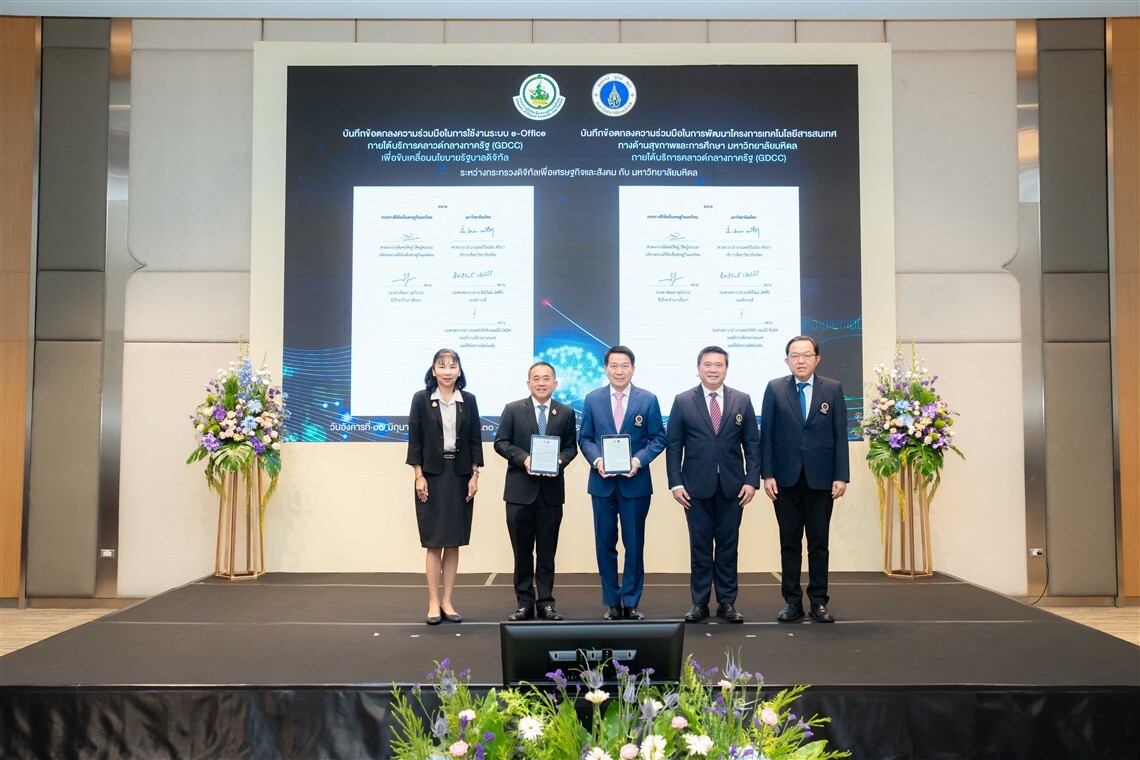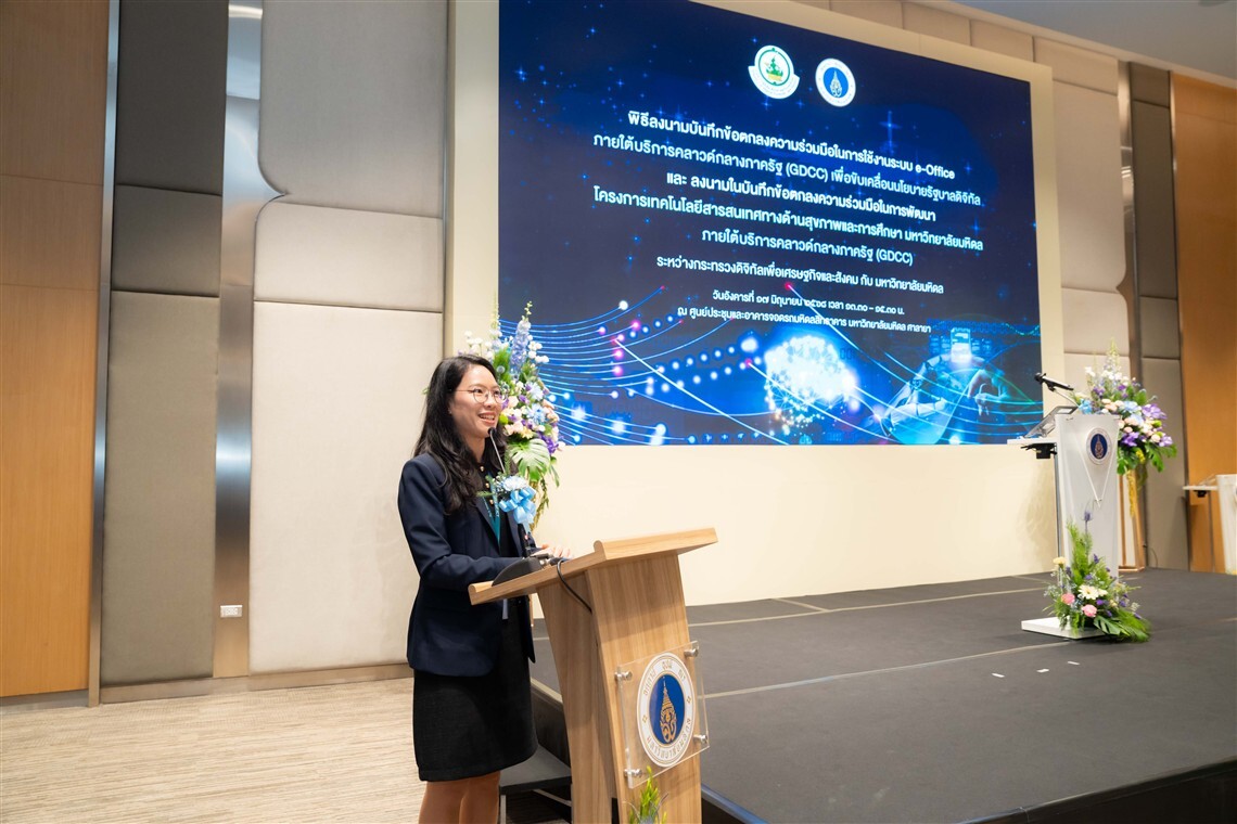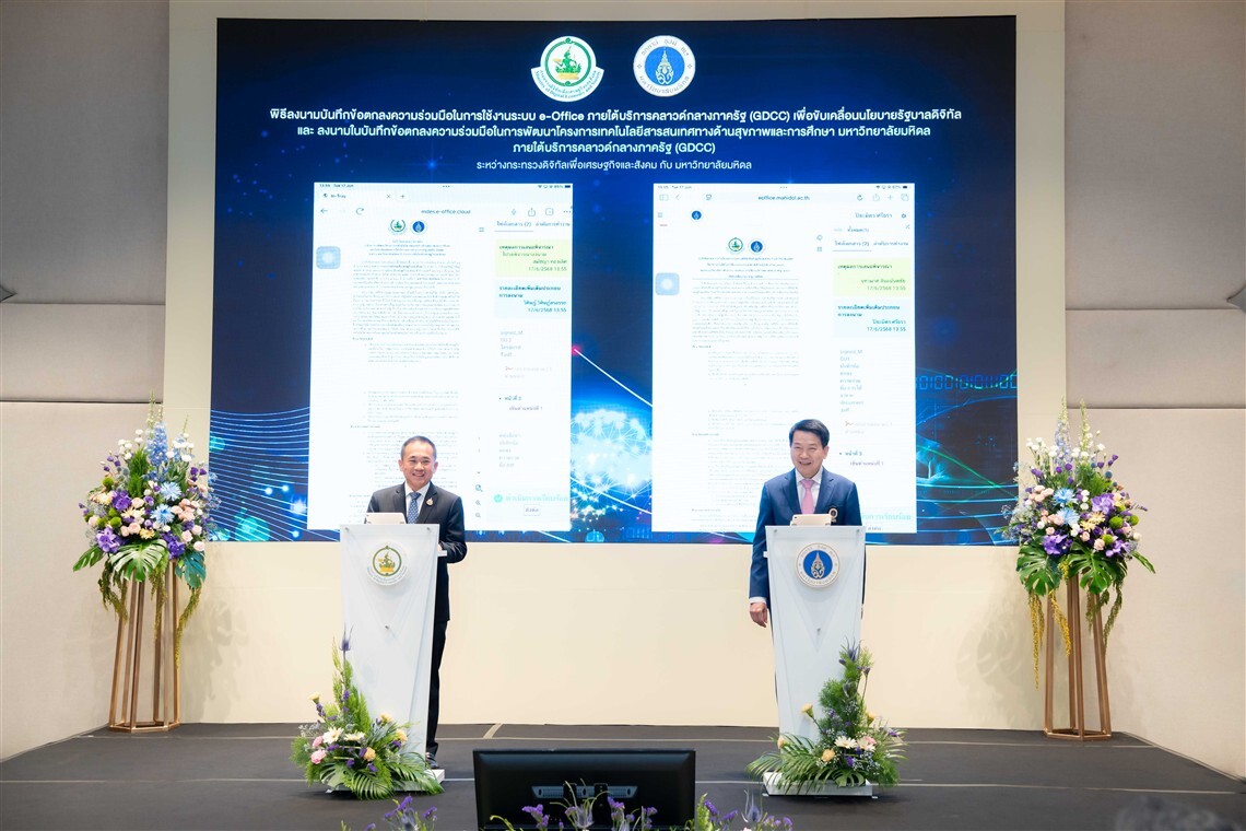 พิธีลงนามบันทึกข้อตกลงความร่วมมือฯ ในครั้งนี้ มีวัตถุประสงค์เพื่อยกระดับประสิทธิภาพการดาเนินงานในหน่วยงานของรัฐ โดยผลักดันให้หน่วยงานภาครัฐใช้ระบบ e-Office ภ า ย ใ ต้ค ล า ว ด์ก ล า ง ภ า ค รัฐ (Government Data Center and Cloud service : GDCC) รวมถึงการสร้างความร่วมมือเพื่อการพัฒนาโครงการเทคโนโลยีสารสนเทศทางด้านสุขภาพและการศึกษาของมหาวิทยาลัยมหิดล ภายใต้บริการคลาวด์กลางภาครัฐ ซึ่งจะเป็นความร่วมมือระหว่างองค์กรในระยะต่อไป
