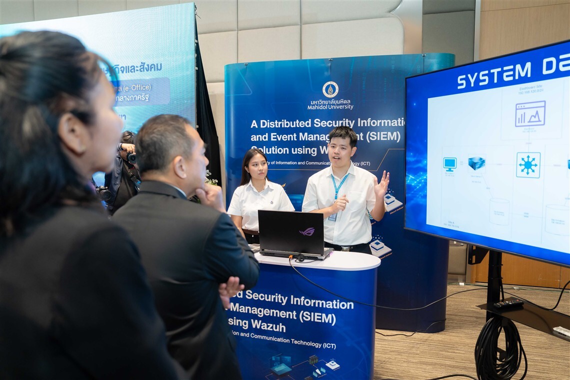 ในโอกาสนี้ คณะ ICT ได้นำผลงานเรื่อง “โซลูชันการจัดการข้อมูลและเหตุการณ์ด้านความปลอดภัยแบบกระจาย โดยใช้ Wazuh (A Distributed Security Information and Event Management (SIEM) Solution using Wazuh)” ซึ่งเป็นผลงาน Senior Project ของนักศึกษาชั้นปี 4 หลักสูตรวิทยาศาสตรบัณฑิต สาขาวิชาเทคโนโลยีสารสนเทศและการสื่อสาร (ICT นานาชาติ) ประกอบด้วย นายภูริณัฐ พัฒนแก้ว นายกิติภูมิ เหมืองทองคำ และนางสาวประกายแก้ว ราชวงษา โดยมี อ.ผกาพร เพ็งศาสตร์ รองคณบดีฝ่ายโครงสร้างพื้นฐานและเทคโนโลยี เป็นที่ปรึกษา เข้าร่วมจัดแสดงนิทรรศการในงานดังกล่าวอีกด้วย
