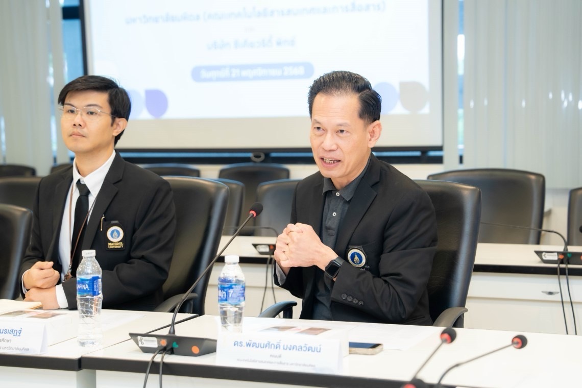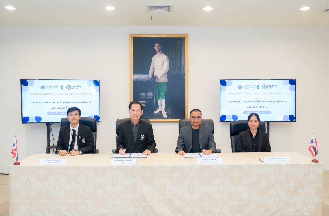 วันที่ 21 พฤศจิกายน 2568 ดร.พัฒนศักดิ์ มงคลวัฒน์ คณบดี คณะเทคโนโลยีสารสนเทศและการสื่อสาร มหาวิทยาลัยมหิดล (ICT Mahidol) ร่วมลงนามบันทึกข้อตกลงความร่วมมือทางวิชาการ (MoU) กับ พ.ต.ต.ปกรณ์ ทองจีน ประธานเจ้าหน้าที่บริหาร บริษัท ซีเคียวริตี้ พิทช์ จำกัด โดยมี ทีมผู้บริหาร และคณาจารย์ คณะ ICT พร้อมด้วย ทีมผู้บริหาร และบุคลากรบริษัท ซีเคียวริตี้ พิทช์ จำกัด ร่วมเป็นสักขีพยาน ณ ห้อง IT404 ชั้น 4 คณะ ICT มหาวิทยาลัยมหิดล ศาลายา