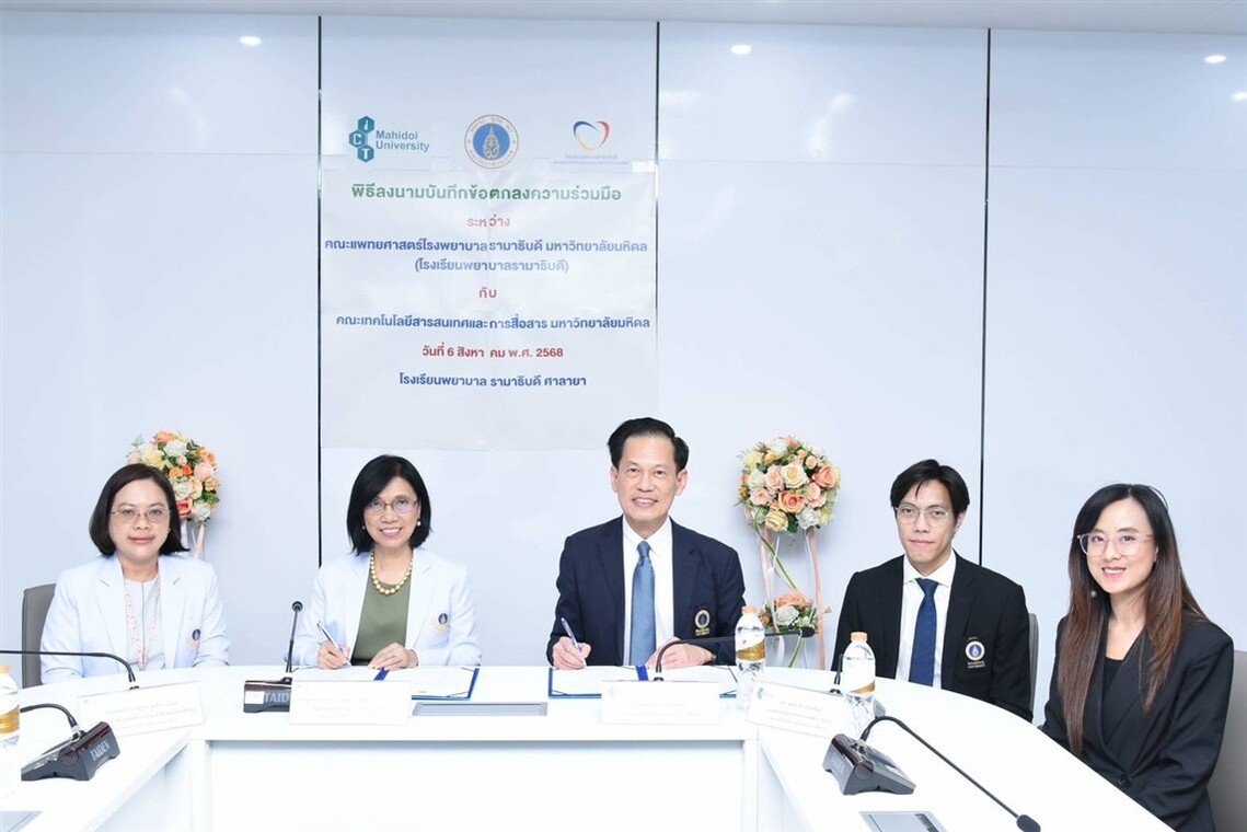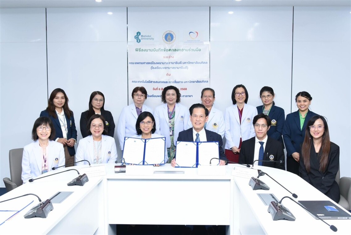 วันที่ 6 สิงหาคม 2568 ดร.พัฒนศักดิ์ มงคลวัฒน์ คณบดี คณะเทคโนโลยีสารสนเทศและการสื่อสาร มหาวิทยาลัยมหิดล (ICT Mahidol) ร่วมลงนามบันทึกข้อตกลงความร่วมมือทางวิชาการ (MoU) กับ รศ.ดร.พูลสุข เจนพานิชย์ วิสุทธิพันธ์ ผู้อำนวยการโรงเรียนพยาบาลรามาธิบดี คณะแพทยศาสตร์โรงพยาบาลรามาธิบดี มหาวิทยาลัยมหิดล โดยมี ดร.เพชร สัจจชลพันธ์ รองคณบดีฝ่ายบริหารและทรัพยากรบุคคล และ ผศ.ดร.ทิพาจินต์ ไทยพิสุทธิกุล ผู้ช่วยคณบดีฝ่ายบริการวิชาการและถ่ายทอดเทคโนโลยี คณะ ICT พร้อมด้วย รศ.ดร.สุปรีดา มั่นคง รองผู้อำนวยการฯ ฝ่ายบัณฑิตศึกษา และบุคลากรโรงเรียนพยาบาลรามาธิบดี ร่วมเป็นสักขีพยาน ณ ห้องประชุม 103 โรงเรียนพยาบาลรามาธิบดี คณะแพทยศาสตร์โรงพยาบาลรามาธิบดี มหาวิทยาลัยมหิดล ศาลายา