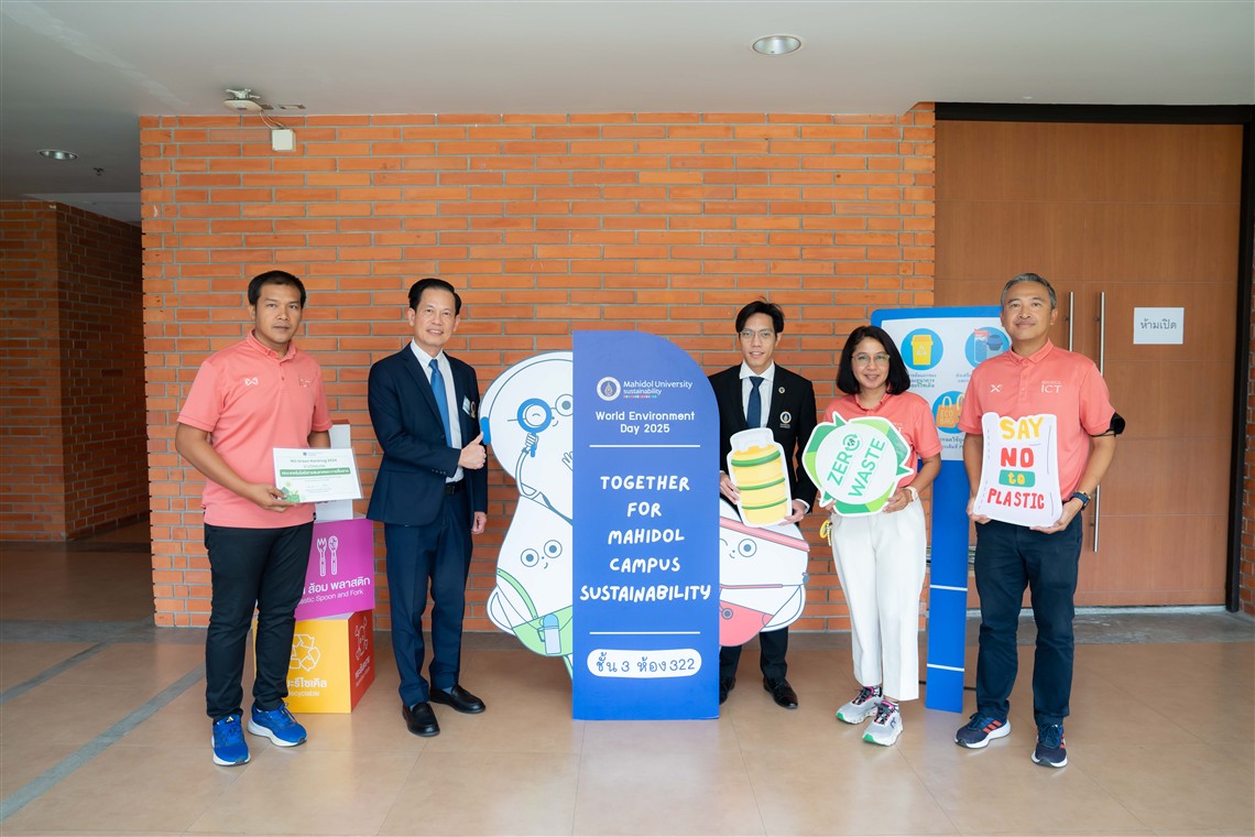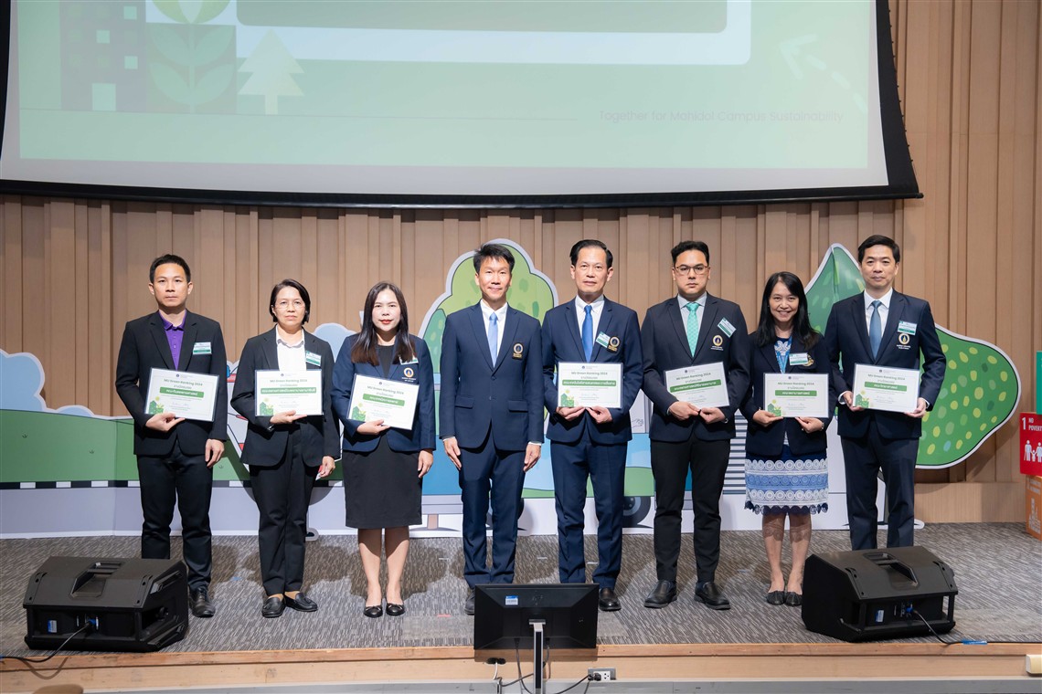 วันที่ 6 มิถุนายน 2568 คณะเทคโนโลยีสารสนเทศและการสื่อสาร มหาวิทยาลัยมหิดล (ICT Mahidol) นำโดย ดร.พัฒนศักดิ์ มงคลวัฒน์ คณบดี พร้อมด้วย ดร.เพชร สัจจชลพันธ์ รองคณบดีฝ่ายบริหารและทรัพยากรบุคคล คุณสมพร บำรุงศรี หัวหน้างานบริหารพัสดุและยานพาหนะ คุณยุทธนา จีนสมุทร รองหัวหน้างานวิศวกรรมและกายภาพ และคุณสมศักดิ์ ธนาศรี หัวหน้าหน่วยอาคารและภูมิทัศน์ ในฐานะคณะทำงานด้านสิ่งแวดล้อมและการพัฒนาที่ยั่งยืน (SDGs) เข้ารับมอบ “เกียรติบัตรรางวัลชมเชย MU Green Ranking 2024” จากการตรวจประเมินการดำเนินงาน ด้านการพัฒนาสิ่งแวดล้อมอย่างยั่งยืน มหาวิทยาลัยมหิดล ประจำปี 2567 โดยได้รับเกียรติจาก ผศ.ดร. อิทธิโชติ จักรไพวงศ์ รองอธิการบดีฝ่ายสิ่งแวดล้อมและการพัฒนาอย่างยั่งยืน มหาวิทยาลัยมหิดล เป็นผู้มอบรางวัล ในงาน Together for Mahidol Campus Sustainability เนื่องในวันสิ่งแวดล้อมโลก ปี 2568 ณ ห้องประชุม 322 ชั้น 3 อาคารศูนย์การเรียนรู้มหิดล (MLC) มหาวิทยาลัยมหิดล ศาลายา
