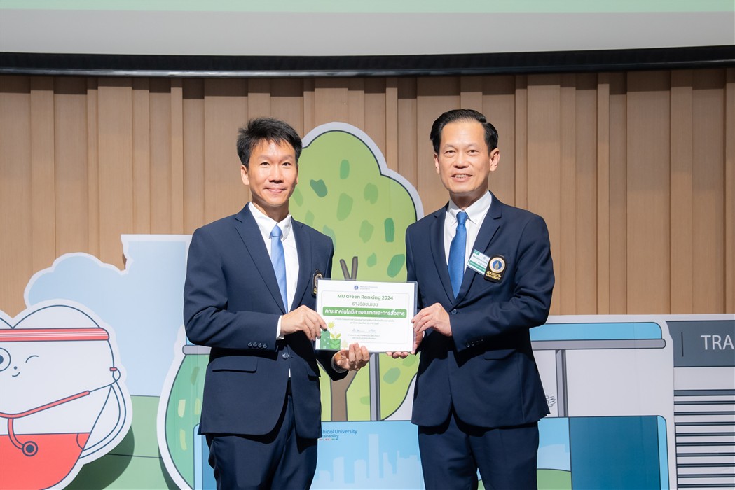 วันที่ 6 มิถุนายน 2568 คณะเทคโนโลยีสารสนเทศและการสื่อสาร มหาวิทยาลัยมหิดล (ICT Mahidol) นำโดย ดร.พัฒนศักดิ์ มงคลวัฒน์ คณบดี พร้อมด้วย ดร.เพชร สัจจชลพันธ์ รองคณบดีฝ่ายบริหารและทรัพยากรบุคคล คุณสมพร บำรุงศรี หัวหน้างานบริหารพัสดุและยานพาหนะ คุณยุทธนา จีนสมุทร รองหัวหน้างานวิศวกรรมและกายภาพ และคุณสมศักดิ์ ธนาศรี หัวหน้าหน่วยอาคารและภูมิทัศน์ ในฐานะคณะทำงานด้านสิ่งแวดล้อมและการพัฒนาที่ยั่งยืน (SDGs) เข้ารับมอบ “เกียรติบัตรรางวัลชมเชย MU Green Ranking 2024” จากการตรวจประเมินการดำเนินงาน ด้านการพัฒนาสิ่งแวดล้อมอย่างยั่งยืน มหาวิทยาลัยมหิดล ประจำปี 2567 โดยได้รับเกียรติจาก ผศ.ดร. อิทธิโชติ จักรไพวงศ์ รองอธิการบดีฝ่ายสิ่งแวดล้อมและการพัฒนาอย่างยั่งยืน มหาวิทยาลัยมหิดล เป็นผู้มอบรางวัล ในงาน Together for Mahidol Campus Sustainability เนื่องในวันสิ่งแวดล้อมโลก ปี 2568 ณ ห้องประชุม 322 ชั้น 3 อาคารศูนย์การเรียนรู้มหิดล (MLC) มหาวิทยาลัยมหิดล ศาลายา