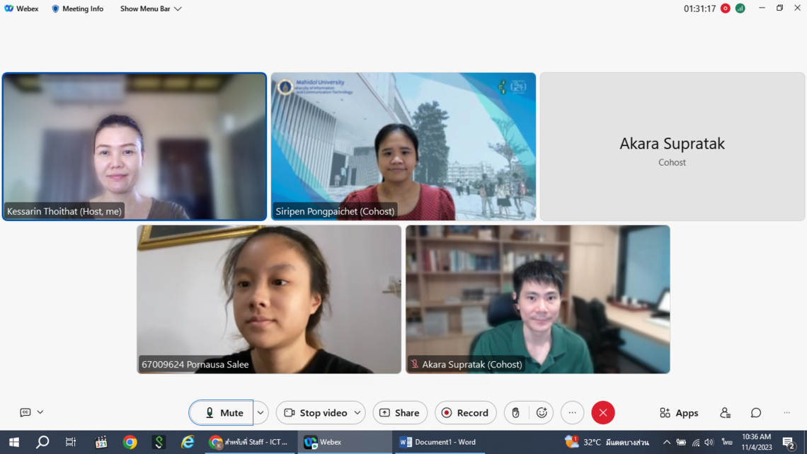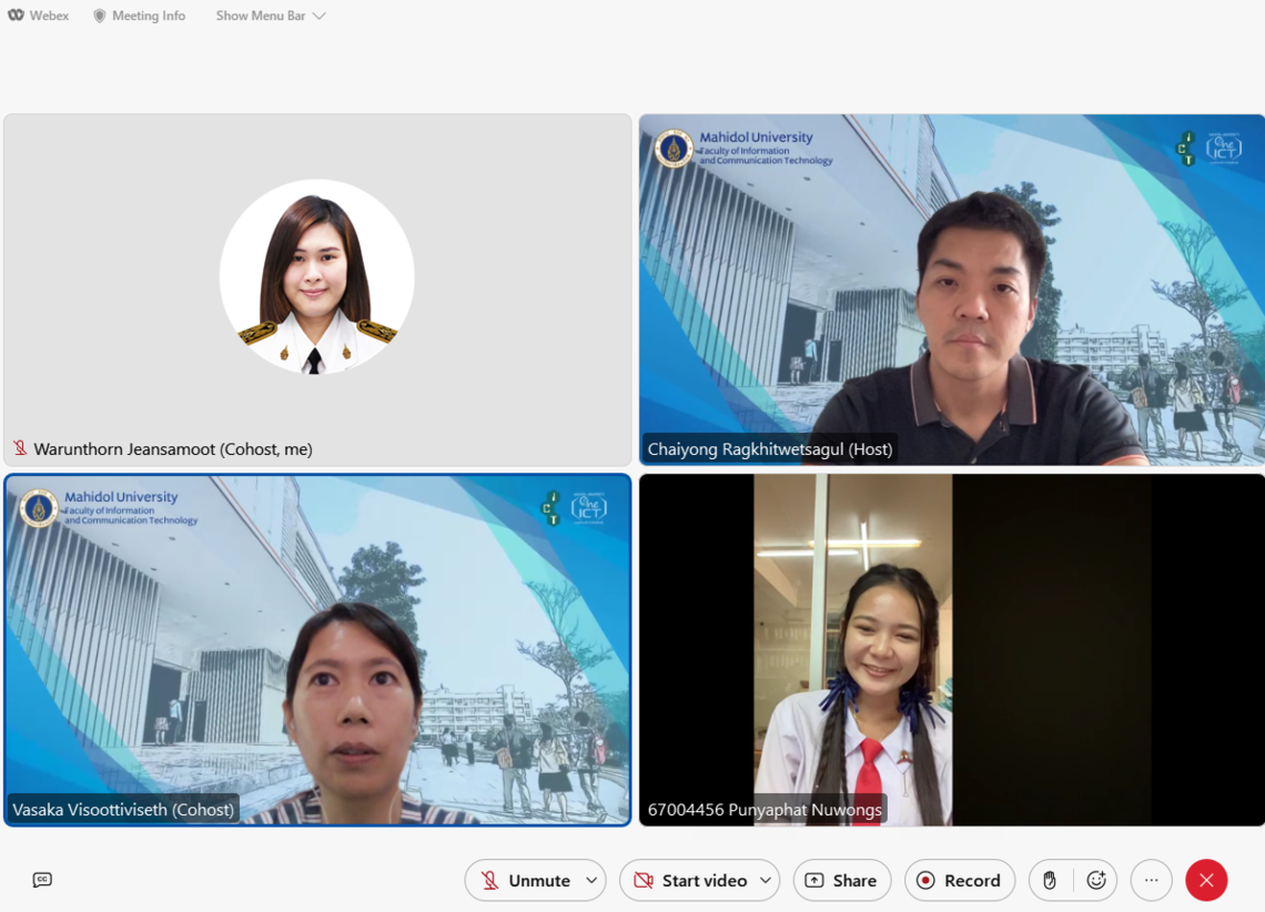 วันที่ 4 พฤศจิกายน 2566 คณะเทคโนโลยีสารสนเทศและการสื่อสาร มหาวิทยาลัยมหิดล (ICT Mahidol) จัดสอบสัมภาษณ์คัดเลือกเข้าศึกษาต่อในระดับปริญญาตรี หลักสูตรวิทยาศาสตรบัณฑิต สาขาวิชาเทคโนโลยีสารสนเทศและการสื่อสาร (ICT หลักสูตรนานาชาติ) และหลักสูตรวิทยาศาสตรบัณฑิต สาขาวิชาวิทยาการและเทคโนโลยีดิจิทัล (DST หลักสูตรไทย) รอบ MU Portfolio (TCAS1) 1/1 ประจำปีการศึกษา 2567 โดยมีนักเรียนเข้าสอบสัมภาษณ์ในรูปแบบออนไลน์ผ่านโปรแกรม Webex Meetings กว่า 240 คน ซึ่งการสัมภาษณ์ครั้งนี้ จะประกาศผลในวันที่ 10 พฤศจิกายน 2566 ผ่านทางเว็บไซต์ https://tcas.mahidol.ac.th/