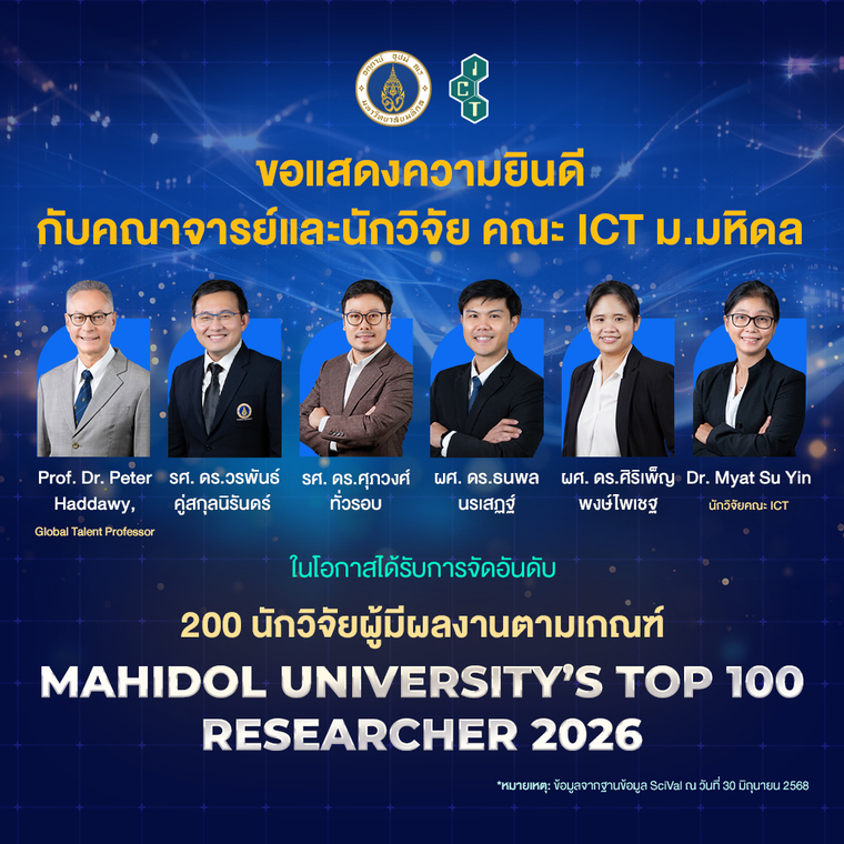 คณะเทคโนโลยีสารสนเทศและการสื่อสาร มหาวิทยาลัยมหิดล (ICT Mahidol) ขอแสดงความยินดีกับคณาจารย์และนักวิจัยคณะ ICT ม.มหิดล (ICT Mahidol) จำนวน 6 ท่าน ที่ได้รับการจัดอันดับเป็น 1 ใน 200 นักวิจัย ผู้มีผลงานตามเกณฑ์ Mahidol University’s Top 100 Researcher 2026 ดังนี้