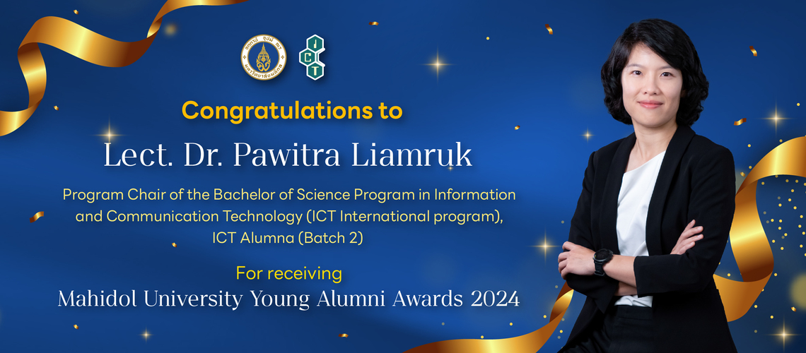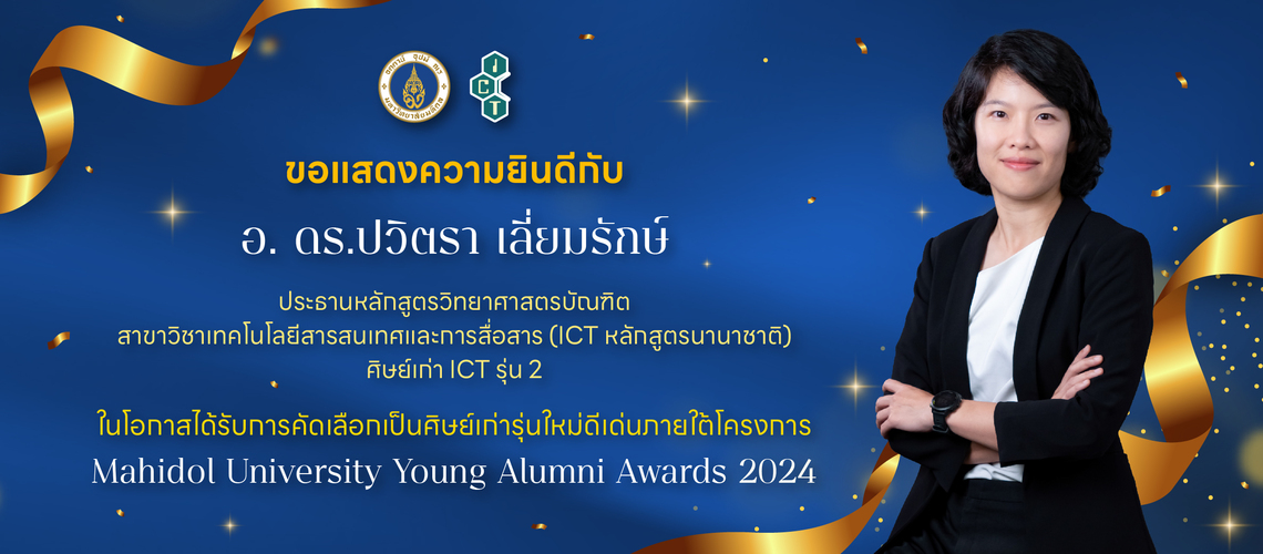 คณะเทคโนโลยีสารสนเทศและการสื่อสาร มหาวิทยาลัยมหิดล (ICT Mahidol) ขอแสดงความยินดีกับ อาจารย์ ดร. ปวิตรา เลี่ยมรักษ์ ศิษย์เก่า ICT รุ่น 2 ซึ่งปัจจุบันดำรงตำแหน่งประธานหลักสูตรวิทยาศาสตรบัณฑิต สาขาวิชาเทคโนโลยีสารสนเทศและการสื่อสาร (ICT หลักสูตรนานาชาติ) ในโอกาสที่ได้รับการคัดเลือกเป็น “ศิษย์เก่ารุ่นใหม่ดีเด่น” ภายใต้ “โครงการ Mahidol University Young Alumni Awards 2024” ของมหาวิทยาลัยมหิดล ซึ่งประกาศผลไปเมื่อวันที่ 22 มกราคม 2567 ที่ผ่านมา