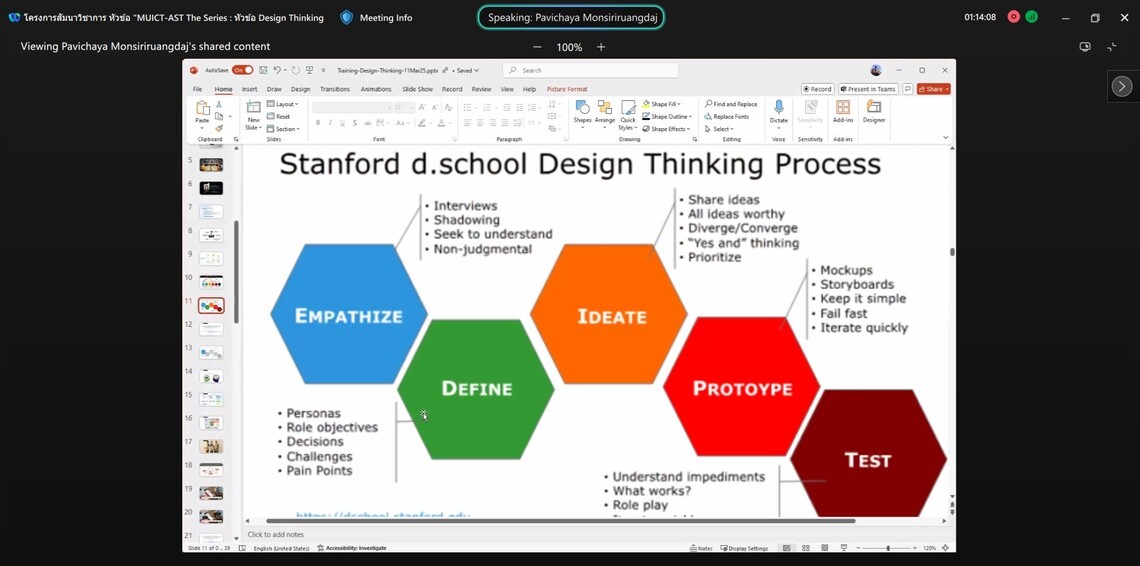 โครงการสัมมนาวิชาการ “MUICT-AST The Series: Empowering Tech Innovation through Security, Agility, and Design” ในหัวข้อ “Design Thinking” จัดขึ้นโดยมีวัตถุประสงค์เพื่อให้ผู้เข้าอบรมได้รับความรู้เกี่ยวกับภาพรวมของการคิดเชิงออกแบบ หรือ Design Thinking ซึ่งเป็นแนวคิดที่ช่วยให้ผู้เข้าอบรมได้ฝึกกระบวนการคิดอย่างเป็นระบบ สามารถคิดนอกกรอบ พร้อมแก้ไขปัญหาด้วยวิธีที่หลากหลาย และสามารถพัฒนานวัตกรรมที่ตอบโจทย์ความต้องการของผู้ใช้ โดยผู้เข้าอบรมสามารถนำองค์ความรู้จากการอบรมครั้งนี้ ไปประยุกต์ใช้กับการทำงานของตนเองได้อย่างมีประสิทธิภาพยิ่งขึ้น