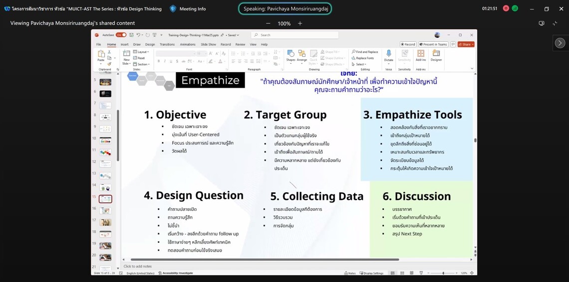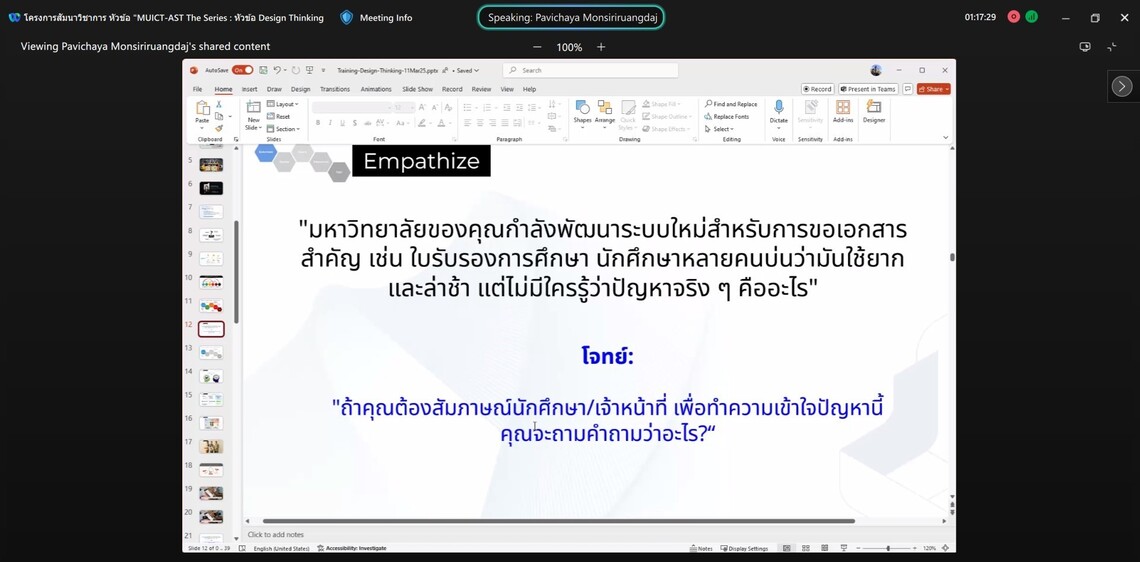 วันที่ 12 มีนาคม 2568 คณะเทคโนโลยีสารสนเทศและการสื่อสาร มหาวิทยาลัยมหิดล (ICT Mahidol) ร่วมกับ บริษัท บลูบิค วัลแคน จำกัด จัดโครงการสัมมนาวิชาการ “MUICT-AST The Series: Empowering Tech Innovation through Security, Agility, and Design” ในหัวข้อ “Design Thinking” โดยได้รับเกียรติจาก คุณปวิชยา มลสิริเรืองเดช Business Unit, Associate Director เป็นวิทยากรถ่ายทอดองค์ความรู้เกี่ยวกับการคิดเชิงออกแบบ หรือ Design Thinking ซึ่งเป็นการฝึกกระบวนการคิดอย่างเป็นระบบ ให้แก่คณาจารย์ บุคลากร นักศึกษามหาวิทยาลัยมหิดล และผู้สนใจ จำนวน 35 คน ในรูปแบบออนไลน์ผ่านโปรแกรม Webex Meeting