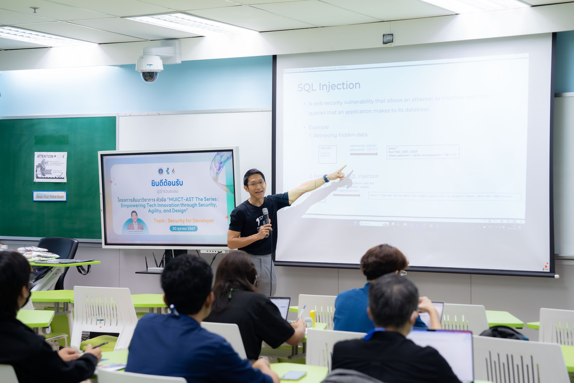 โครงการสัมมนาวิชาการ “MUICT-AST The Series: Empowering Tech Innovation through Security, Agility, and Design” ในหัวข้อ “Security for Developer” จัดขึ้นโดยมีวัตถุประสงค์เพื่อให้ผู้เข้าอบรม ได้รับความรู้เกี่ยวกับภาพรวมของงานด้านการดูแลความปลอดภัยซอฟต์แวร์ ความรู้พื้นฐานสำหรับการเขียนโปรแกรมให้มีความปลอดภัย วิธีการสร้างความปลอดภัยให้กับระบบ Web Application และ บทบาทหน้าที่ของตำแหน่งงาน Security Tester และ DevSecOps (Development, Security, Operations) ซึ่งจะช่วยให้ผู้เข้าอบรมสามารถนำองค์ความรู้จากการอบรมครั้งนี้ ไปประยุกต์ใช้กับการทำงานของตนเองได้อย่างมีประสิทธิภาพยิ่งขึ้น