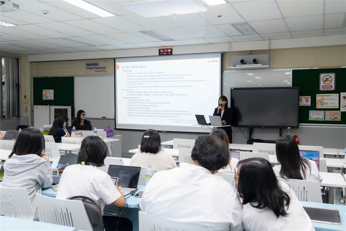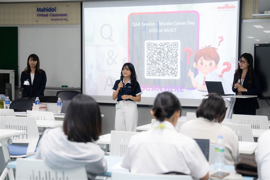 วันที่ 17 พฤศจิกายน 2568 คณะเทคโนโลยีสารสนเทศและการสื่อสาร มหาวิทยาลัยมหิดล (ICT Mahidol) จัดกิจกรรม “Murata Career Day 2025” โดยได้รับเกียรติจากทีมวิทยากรบริษัท Murata Manufacturing Co., Ltd. ประกอบด้วย Mr. Takashi Shimomukai, General Manager of Business Engineering Division และ Ms. Shelly Chiharu Shimizu, Assistant Manager of Digital Transformation Innovator Department จากบริษัท Murata Manufacturing Co., Ltd. สาขาประเทศสิงคโปร์ และ Ms. Amal Topa, Data Scientist จากบริษัท Murata Manufacturing Co., Ltd. สาขาประเทศไทย ร่วมบรรยายแนะนำข้อมูลของบริษัท ทั้งในด้านข้อมูลองค์กร วัฒนธรรมการทำงาน และสร้างโอกาสในการพัฒนาศักยภาพด้านอาชีพในสายเทคโนโลยี ให้แก่นักศึกษาชั้นปีที่ 3 หลักสูตรวิทยาศาสตรบัณฑิต สาขาวิชาวิทยาการและเทคโนโลยีดิจิทัล (DST หลักสูตรไทย) ณ ห้อง IT204 ชั้น 2 คณะ ICT มหาวิทยาลัยมหิดล ศาลายา