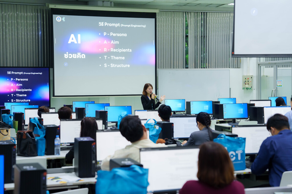 การอบรมในครั้งนี้ ได้รับเกียรติจากคุณศิริรัตน์ วิทยาคุณสถิต นักวิชาการโสตทัศนศึกษา งานโสตและเทคโนโลยีสื่อการศึกษา เป็นวิทยากรถ่ายทอดองค์ความรู้เกี่ยวกับการนำเทคโนโลยีปัญญาประดิษฐ์ (Artificial Intelligence หรือ AI) ที่ได้รับความนิยมในปัจจุบัน อาทิ ChatGPT, Microsoft Copilot, Google Gemini มาประยุกต์ใช้ในการสร้างสรรค์สื่อการเรียนรู้ และการใช้งานร่วมกับโปรแกรม Canva เพื่อนำไปประยุกต์ใช้กับการสอนนักเรียนได้มีประสิทธิภาพมากยิ่งขึ้น