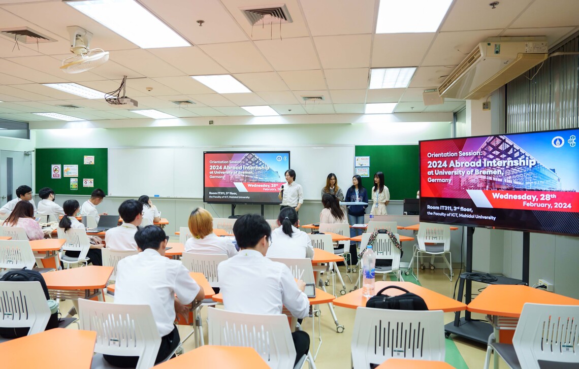 วันที่ 28 กุมภาพันธ์ 2567 คณะเทคโนโลยีสารสนเทศและการสื่อสาร มหาวิทยาลัยมหิดล (ICT Mahidol) จัดกิจกรรม Orientation Session: 2024 Internship at University of Bremen ให้แก่นักศึกษามหาวิทยาลัยมหิดล ที่จะเดินทางไปฝึกประสบการณ์วิชาชีพด้าน ICT ณ University of Bremen ประเทศเยอรมนี จำนวน 13 คน โดยแบ่งออกเป็น นักศึกษาหลักสูตรวิทยาศาสตรบัณฑิต สาขาวิชาเทคโนโลยีสารสนเทศและการสื่อสาร (ICT นานาชาติ) จำนวน 12 คน และ นักศึกษาจากคณะเวชศาสตร์เขตร้อน จำนวน 1 คน