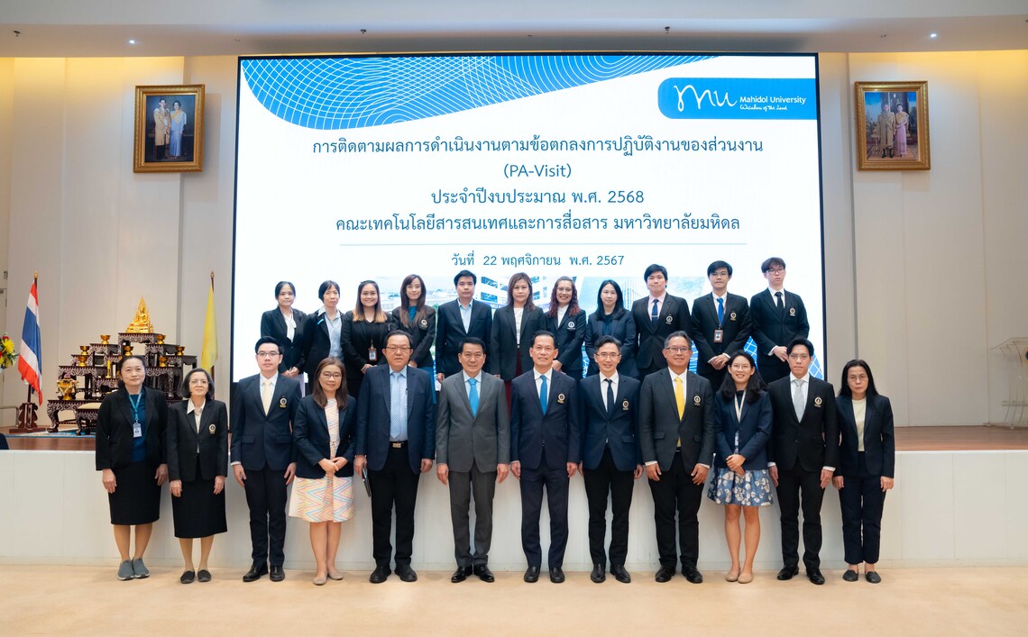 ในโอกาสนี้ ดร. พัฒนศักดิ์ มงคลวัฒน์ คณบดี ได้นำเสนอผลการดำเนินงานที่โดดเด่นในรอบปีงบประมาณที่ผ่านมา และแผนการดำเนินงานที่สำคัญของปีงบประมาณ 2568 ของคณะฯ พร้อมรับฟังข้อเสนอแนะในการดำเนินงาน จากคณะผู้บริหารมหาวิทยาลัยมหิดล