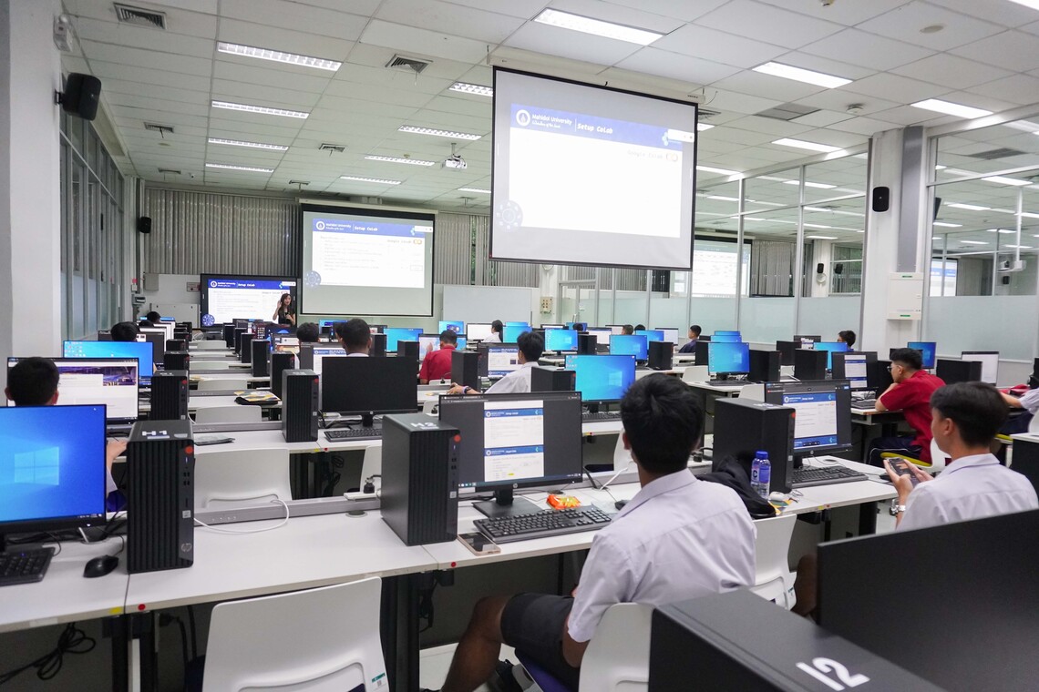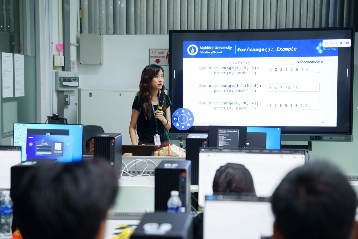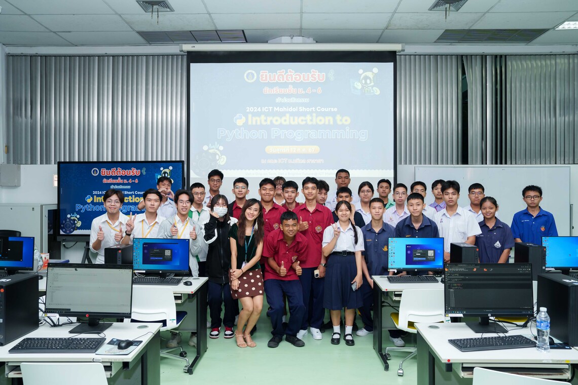 วันที่ 12 กรกฎาคม 2567 คณะเทคโนโลยีสารสนเทศและการสื่อสาร มหาวิทยาลัยมหิดล (ICT Mahidol) จัดกิจกรรม ICT Mahidol Short Course หัวข้อ “Introduction to Python” ให้แก่นักเรียนระดับชั้นมัธยมศึกษาตอนปลาย โดยได้รับเกียรติจาก ดร. ทิพาจินต์ ไทยพิสุทธิกุล ผู้ช่วยคณบดีฝ่ายบริการและถ่ายทอดเทคโนโลยี เป็นวิทยากรให้ความรู้เกี่ยวกับการเขียนโปรแกรมโดยใช้ภาษา Python ในเบื้องต้น โดยมีผู้เข้าอบรม 25 คน ณ ห้องปฏิบัติการคอมพิวเตอร์ IT105 ชั้น 1 คณะ ICT มหาวิทยาลัยมหิดล ศาลายา