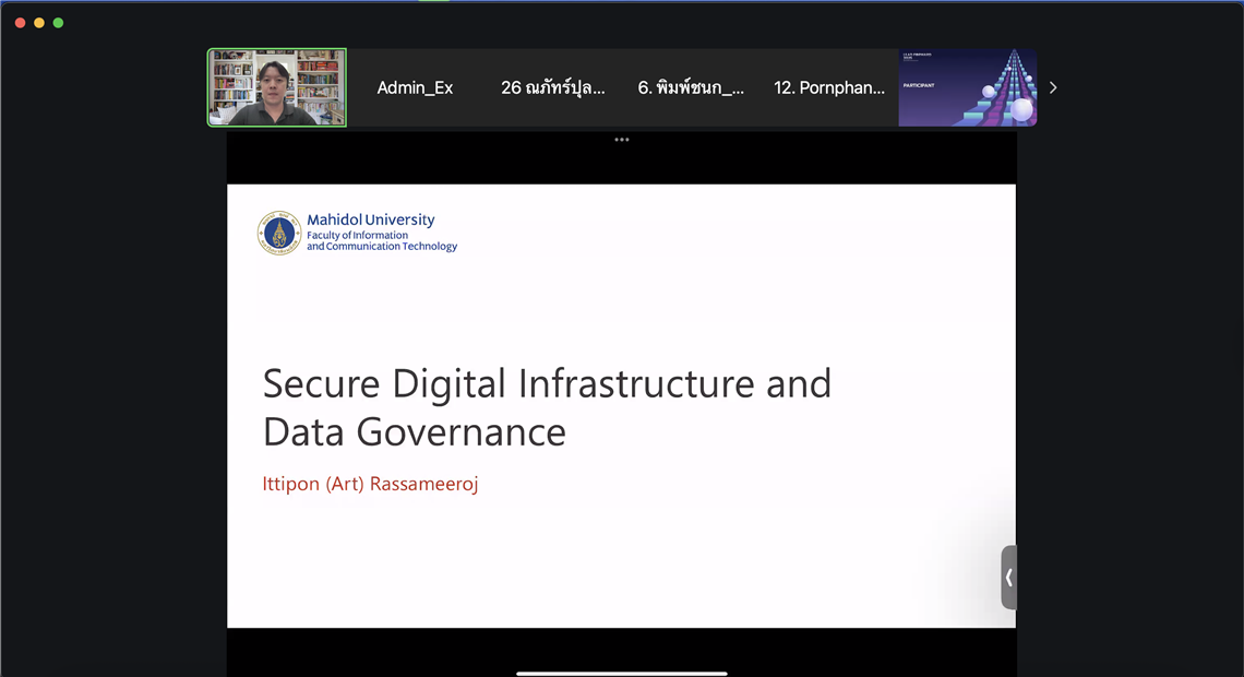 วันที่ 10 กันยายน 2568 ดร.อิทธิพล รัศมีโรจน์ ผู้ช่วยคณบดีฝ่ายโครงสร้างพื้นฐานและเทคโนโลยี คณะเทคโนโลยีสารสนเทศและการสื่อสาร มหาวิทยาลัยมหิดล (ICT Mahidol) ได้รับเชิญเป็นวิทยากรบรรยายในหัวข้อ “โครงสร้างพื้นฐานดิจิทัลปลอดภัย และการบริหารจัดการข้อมูลอย่างเป็นระบบ (Secure Digital Infrastructure & Data Governance)” ให้กับบุคลากรภาครัฐในระดับผู้นำ ในรูปแบบออนไลน์ผ่านโปรแกรม Zoom