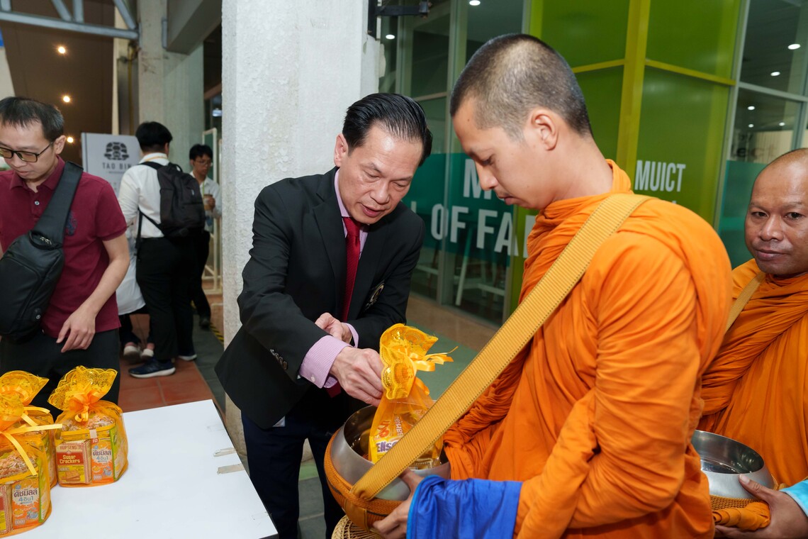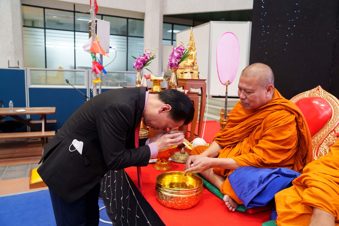 วันที่ 4 เมษายน 2567 คณะเทคโนโลยีสารสนเทศและการสื่อสาร มหาวิทยาลัยมหิดล (ICT Mahidol) จัดกิจกรรม “ทำบุญตักบาตร สรงน้ำพระภิกษุสงฆ์ รับพร เพื่อเป็นสิริมงคล เนื่องในประเพณีสงกรานต์ ประจำปี 2567” โดยได้รับเกียรติจาก ดร. พัฒนศักดิ์ มงคลวัฒน์ คณบดี นำทีมผู้บริหาร คณาจารย์ บุคลากร และนักศึกษา ร่วมสืบสานกิจกรรมอนุรักษ์ประเพณีวัฒนธรรมไทย เนื่องในวารดิถีวันขึ้นปีใหม่ไทย หรือวันสงกรานต์ อาทิ ตักบาตรอาหารแห้ง ถวายปัจจัยไทยธรรม กรวดน้ำรับพร สรงน้ำพระ และฟังธรรมจากพระสงฆ์วัดสาลวัน จำนวน 9 รูป ณ ลาน Innovative Space ชั้น 1 คณะ ICT มหาวิทยาลัยมหิดล ศาลายา