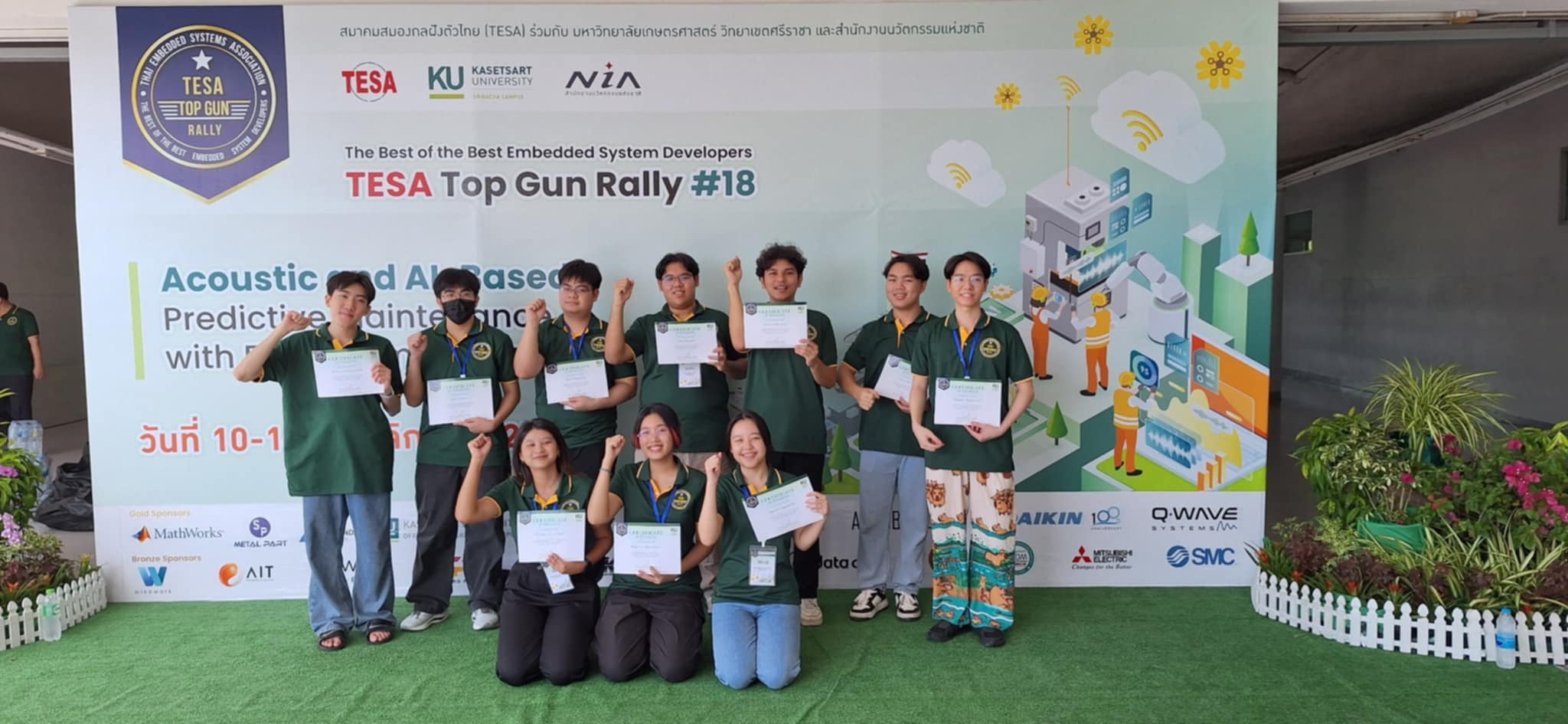 “การแข่งขันประชันทักษะทางด้านระบบสมองกลฝังตัวชิงแชมป์ประเทศไทยครั้งที่ 18 (TESA Top Gun Rally 2024)” มีผู้เข้าร่วมการแข่งขัน จำนวน 50 ทีม จาก 26 สถาบันการศึกษาทั่วประเทศ ซึ่งเป็นโครงการที่จัดขึ้นโดยสมาคมสมองกลฝังตัวไทย (TESA) ร่วมกับ มหาวิทยาลัยเกษตรศาสตร์ วิทยาเขตศรีราชา และสำนักงานนวัตกรรมแห่งชาติ (NIA) มีวัตถุประสงค์เพื่อส่งเสริมผู้มีความสามารถด้านระบบสมองกลฝังตัว ได้นำความคิดสร้างสรรค์ และเทคนิคการบำรุงรักษาเชิงคาดการณ์ (Predictive Maintenance) ที่ใช้เทคโนโลยีเสียง (Acoustic) ร่วมกับเทคโนโลยีปัญญาประดิษฐ์ (AI) และการคำนวณผลต้นทาง (Edge Computing) มาบูรณาการร่วมกันเพื่อวิเคราะห์และคาดการณ์ความผิดปกติในระบบอุปกรณ์หรือเครื่องจักร เพื่อป้องกันการเสียหายที่อาจจะเกิดขึ้น เมื่อเครื่องจักรหยุดทำงาน