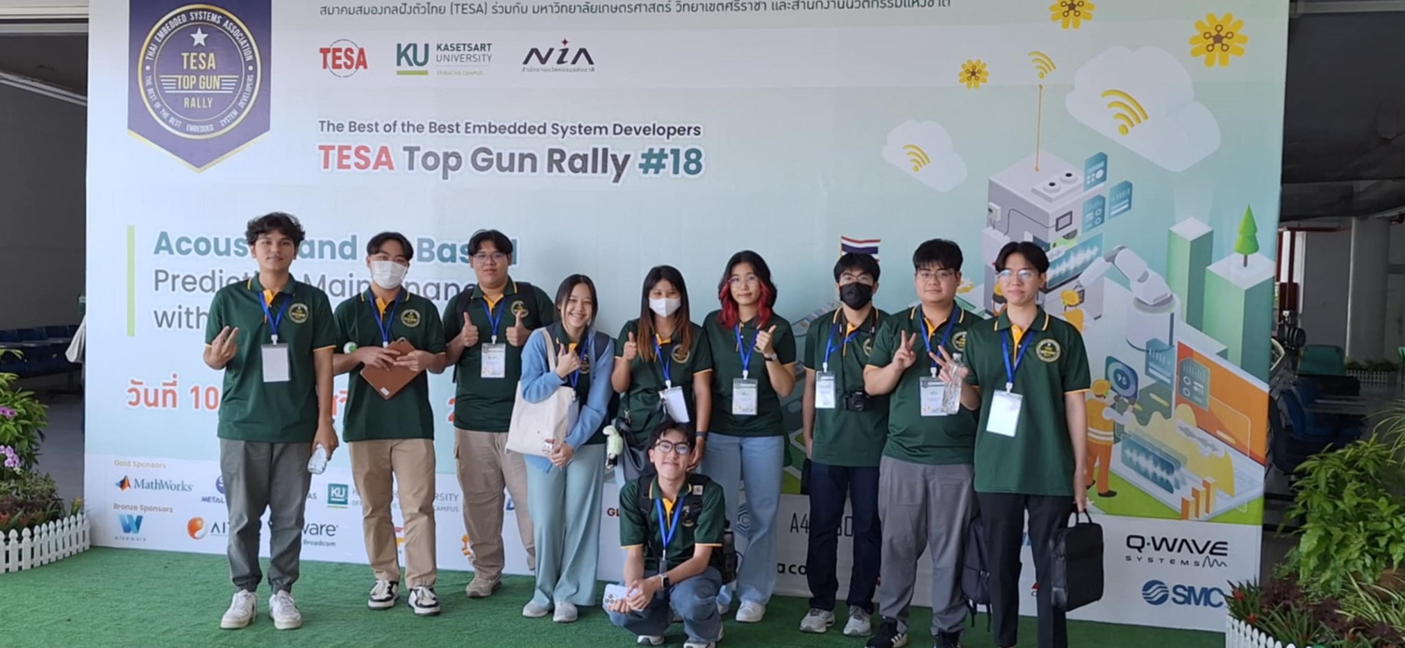 “การแข่งขันประชันทักษะทางด้านระบบสมองกลฝังตัวชิงแชมป์ประเทศไทยครั้งที่ 18 (TESA Top Gun Rally 2024)” มีผู้เข้าร่วมการแข่งขัน จำนวน 50 ทีม จาก 26 สถาบันการศึกษาทั่วประเทศ ซึ่งเป็นโครงการที่จัดขึ้นโดยสมาคมสมองกลฝังตัวไทย (TESA) ร่วมกับ มหาวิทยาลัยเกษตรศาสตร์ วิทยาเขตศรีราชา และสำนักงานนวัตกรรมแห่งชาติ (NIA) มีวัตถุประสงค์เพื่อส่งเสริมผู้มีความสามารถด้านระบบสมองกลฝังตัว ได้นำความคิดสร้างสรรค์ และเทคนิคการบำรุงรักษาเชิงคาดการณ์ (Predictive Maintenance) ที่ใช้เทคโนโลยีเสียง (Acoustic) ร่วมกับเทคโนโลยีปัญญาประดิษฐ์ (AI) และการคำนวณผลต้นทาง (Edge Computing) มาบูรณาการร่วมกันเพื่อวิเคราะห์และคาดการณ์ความผิดปกติในระบบอุปกรณ์หรือเครื่องจักร เพื่อป้องกันการเสียหายที่อาจจะเกิดขึ้น เมื่อเครื่องจักรหยุดทำงาน