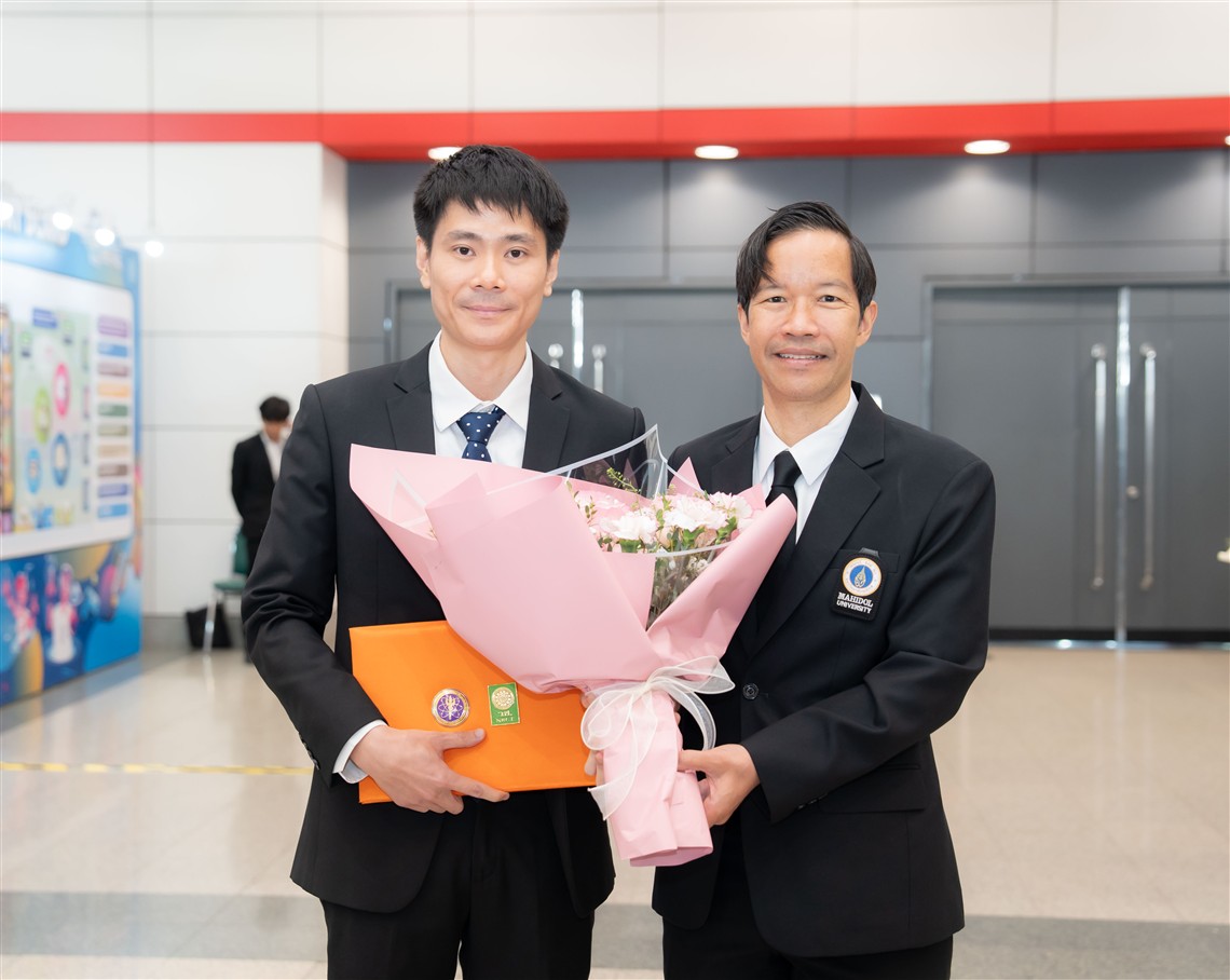 ในโอกาสนี้ ศาสตราจารย์ นายแพทย์ หม่อมหลวงชาครีย์ กิติยากร รองอธิการบดีฝ่ายวิจัย มหาวิทยาลัยมหิดล ได้ให้เกียรติมอบช่อดอกไม้แสดงความยินดีแก่คณาจารย์ของมหาวิทยาลัยมหิดลที่ได้รับรางวัล โดยมี ดร.วุฒิชาติ แสวงผล ผู้ช่วยคณบดีฝ่ายวิจัย คณะ ICT เป็นผู้แทนคณบดี ร่วมมอบช่อดอกไม้แสดงความยินดีแก่คณาจารย์ของคณะฯ โดยในปีนี้ มีคณาจารย์ของคณะฯ ได้รับรางวัล จำนวน 3 ท่าน ได้แก่