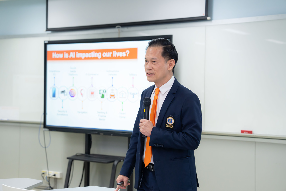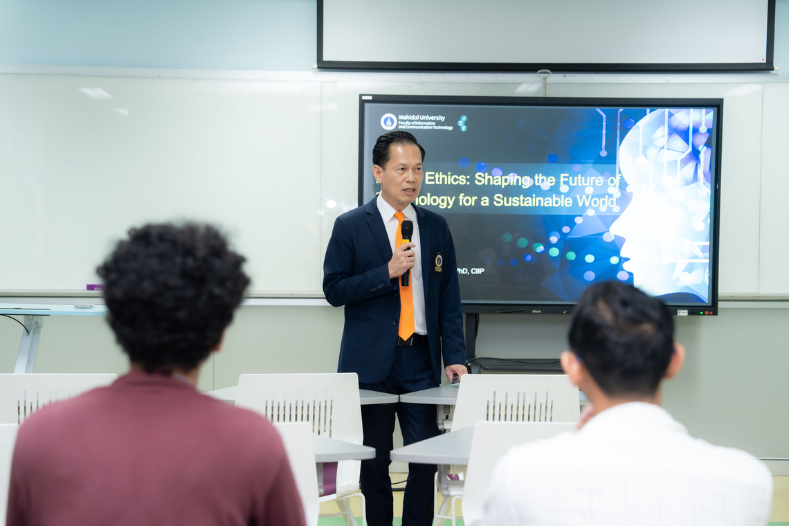 ในการเยี่ยมชมครั้งนี้ ดร.พัฒนศักดิ์ มงคลวัฒน์ ได้ให้เกียรติเป็นวิทยากรบรรยายในหัวข้อ “AI and Ethics: Shaping the Future of Technology for a Sustainable World” ณ ห้อง IT302 คณะ ICT มหาวิทยาลัยมหิดล ศาลายา พร้อมกันนี้ ดร.ปวิตรา เลี่ยมรักษ์ ได้นำอาคันตุกะเยี่ยมชมสถานที่ และสิ่งอำนวยความสะดวกด้านการเรียนการสอนของคณะฯ อาทิ ห้องปฏิบัติการคอมพิวเตอร์ ห้อง Smart Classroom ห้องประชุม Grand Auditorium และห้องปฏิบัติการ IoT Laboratory โดยมีคุณธมกร เจียมรชดา นักวิชาการคอมพิวเตอร์ งานโครงสร้างพื้นฐานเทคโนโลยี ร่วมแนะนำห้องปฏิบัติการ