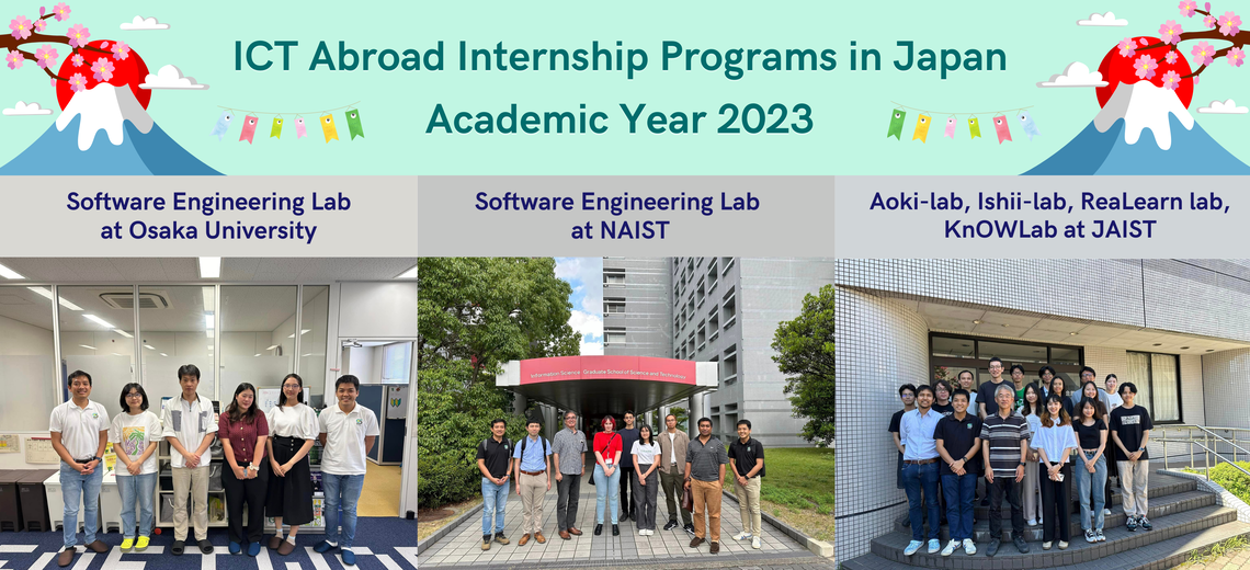 - วันที่ 31 กรกฎาคม 2567 – 1 สิงหาคม 2567 เป็นการเข้าเยี่ยมเยียนนักศึกษา ณ ห้องปฏิบัติการ Aoki-lab, Ishii-lab, ReaLearn lab, และ KnOWLab, Japan Advance Institute of Science and Technology (JAIST) โดยได้รับเกียรติจาก Toshiaki Aoki, Assoc. Prof. Dr. Daisuke Ishii, ดร. ธีรเดช ราชรักษ์ (Senior Lecturer), ดร. ณัฐวุฒิ เกิดเกียรติขจร (Senior Lecturer) ให้การต้อนรับ พร้อมหารือเกี่ยวกับความร่วมมือด้านการวิจัยในอนาคต นอกจากนี้ ยังมีการจัด Workshop เพื่อให้นักศึกษาได้นำเสนอผลงานการศึกษาของตนอีกด้วย โดยนักศึกษาที่ฝึกประสบการณ์วิชาชีพด้าน ICT ณ Japan Advance Institute of Science and Technology (JAIST) ประกอบไปด้วย