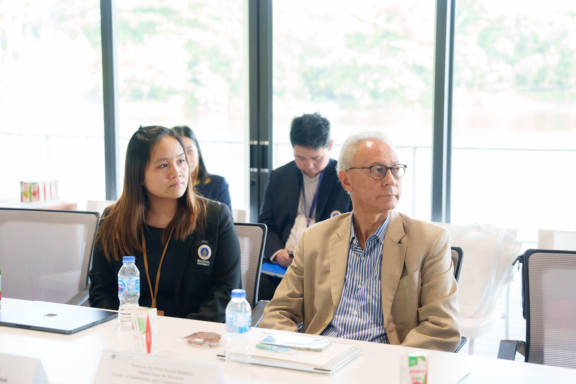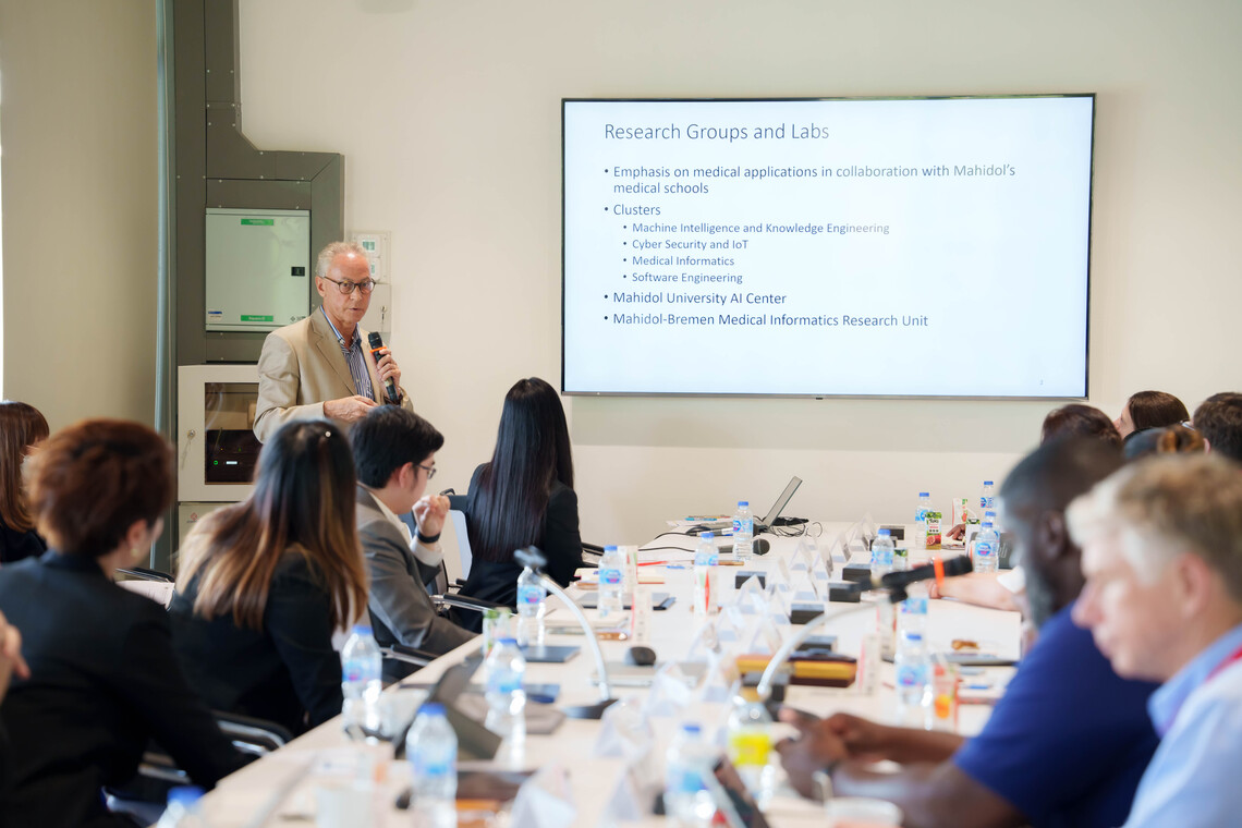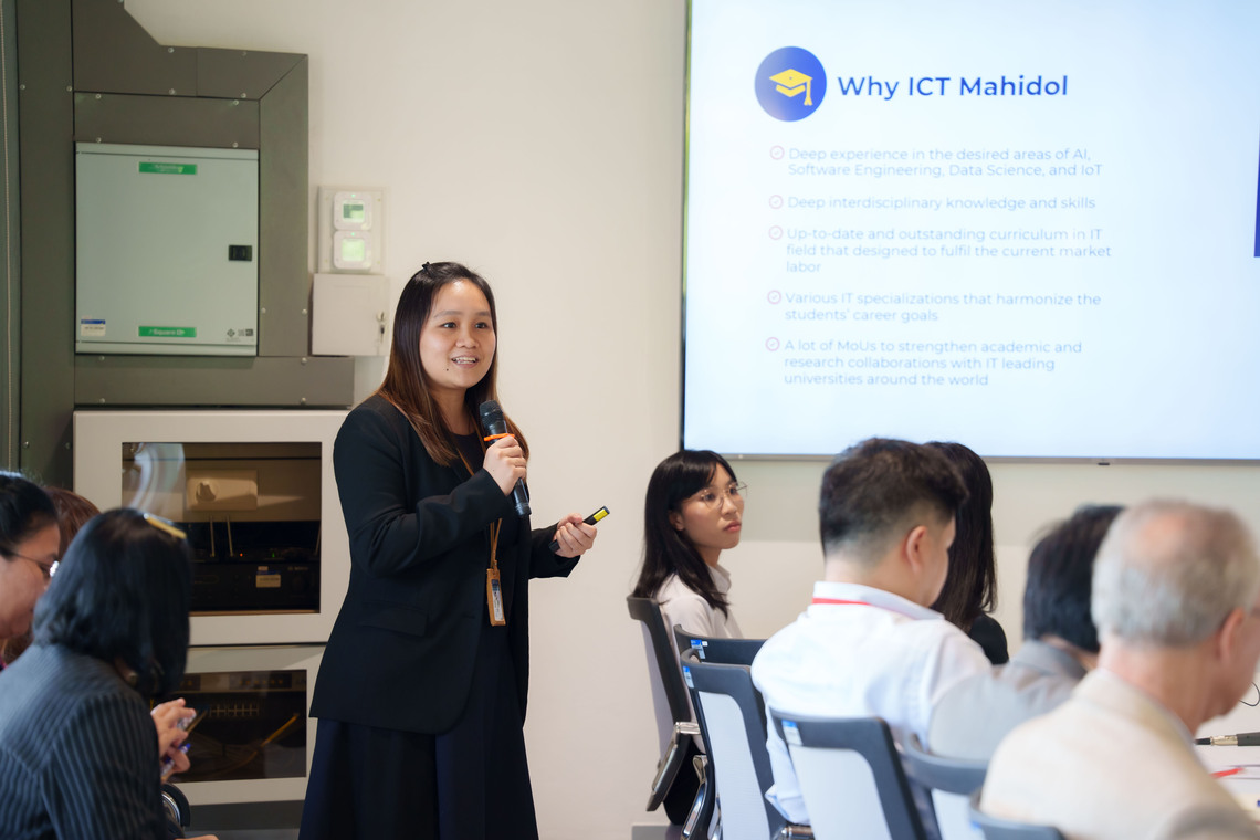 ในโอกาสนี้ Prof. Dr. Peter Haddawy รองคณบดีฝ่ายวิจัย และ ผศ.ดร. จิดาภา ไกรสังข์ ผู้ช่วยคณบดีฝ่ายพัฒนาหลักสูตร ยังได้ร่วมนำเสนอข้อมูลของคณะ ICT อาทิ หลักสูตรต่างๆ ที่เปิดสอน และผลงานวิจัยที่ได้รับการตีพิมพ์ของคณะฯ ให้แก่อาคันตุกะ