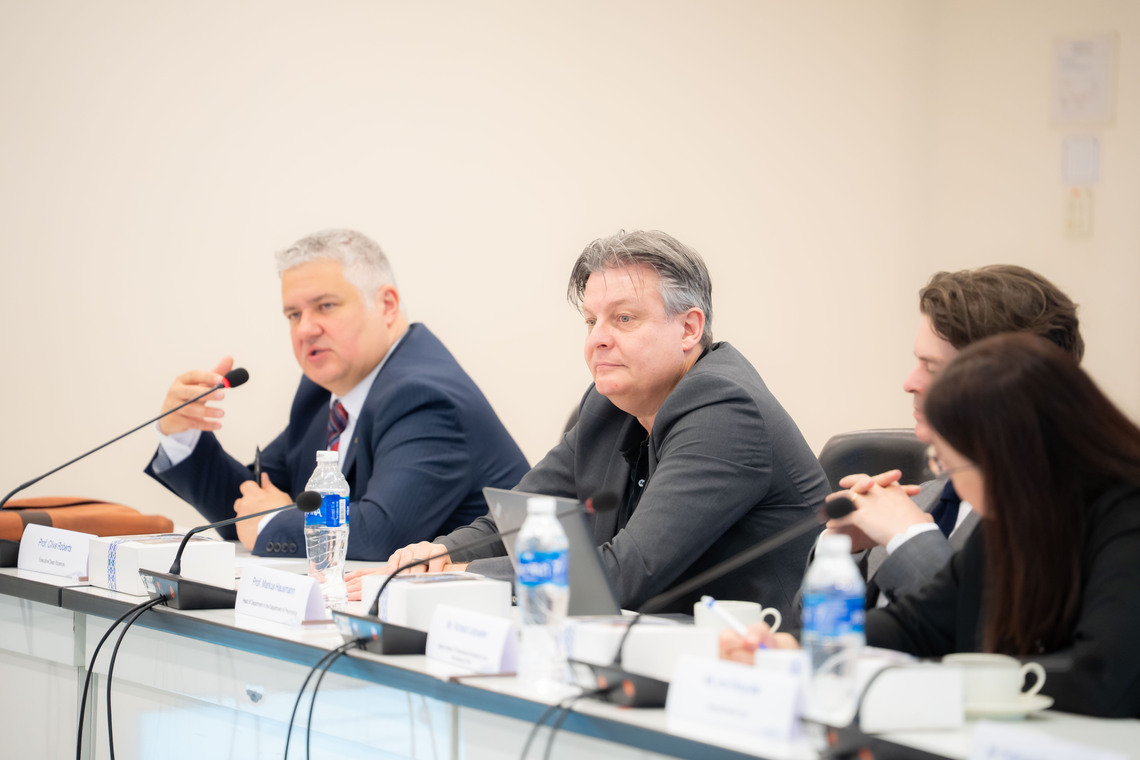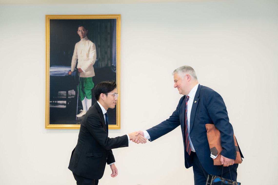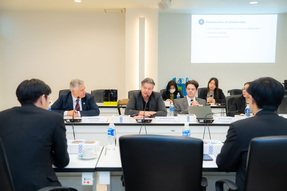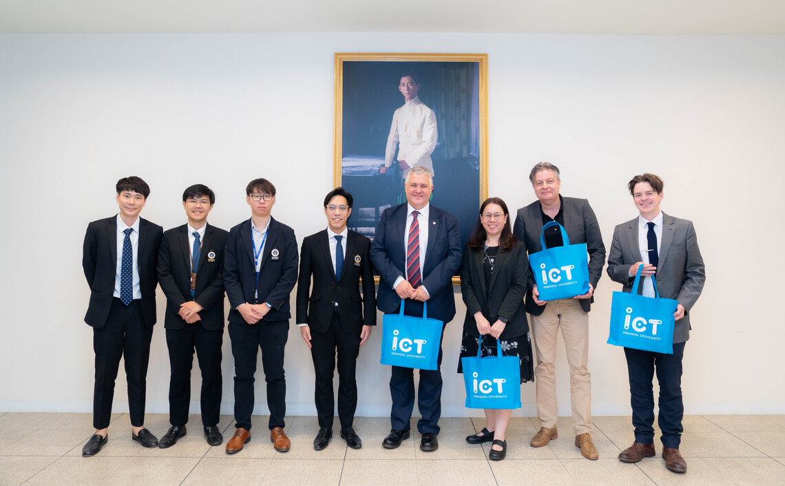 วันที่ 21 พฤษภาคม 2568 ดร.เพชร สัจจชลพันธ์ รองคณบดีฝ่ายบริหารและทรัพยากรบุคคล คณะเทคโนโลยีสารสนเทศและการสื่อสาร มหาวิทยาลัยมหิดล (ICT Mahidol) เป็นผู้แทนคณบดี พร้อมด้วย ผศ. ดร.ธนพล นรเสฏฐ์ ผู้ช่วยคณบดีฝ่ายการศึกษา ดร.พิสิฐ ไพรวัฒนา ผู้ช่วยคณบดีฝ่ายสื่อสารองค์กรและเทคโนโลยีสื่อ และ ผศ. ดร.อัคร สุประทักษ์ อาจารย์ประจำกลุ่มวิชาวิทยาการคอมพิวเตอร์ ร่วมให้การต้อนรับอาคันตุกะจาก Durham University สหราชอาณาจักร ในโอกาสเข้าเยี่ยมเยียนมหาวิทยาลัยมหิดล และประชุมหารือความร่วมมือด้านวิชาการและการวิจัยร่วมกันในอนาคต อาทิ การวิจัยด้าน Medical Data Science และ Computer Science การแลกเปลี่ยนนักศึกษา และการจัดทำหลักสูตร Dual Degree ณ ห้อง IT404 ชั้น 4 คณะ ICT มหาวิทยาลัยมหิดล ศาลายา