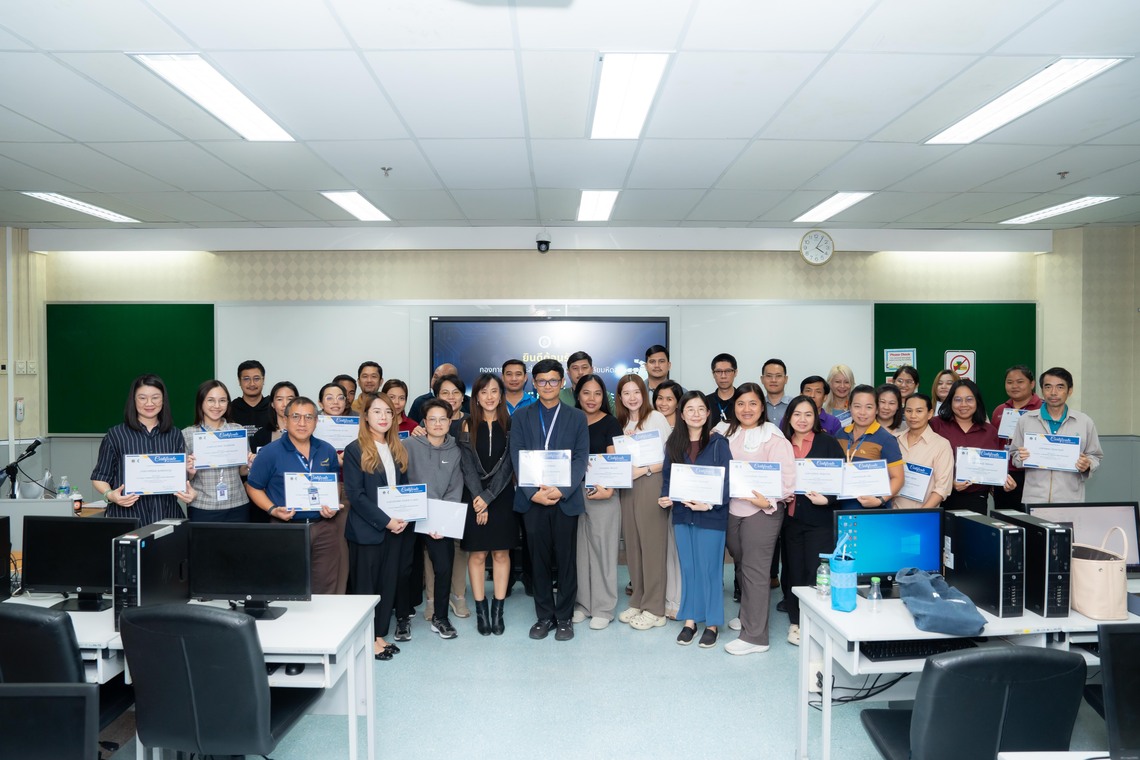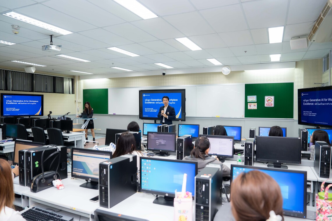 On February 25, 2025, the Faculty of Information and Communication Technology, Mahidol University (ICT Mahidol), hosted a workshop on the topic “AI Literacy: Enhancing AI Skills for More Effective Work.” The event was honored by the opening speech of Asst. Prof. Dr. Ittichote Chuckpaiwong, Vice President for Infrastructure and Environment. On this occasion, Asst. Prof. Dr. Tipajin Thaipisutikul, Assistant Dean for Academic Services and Technology Transfer, shared insights on using the Artificial Intelligence Tool (AI Tool) “Microsoft Co-Pilot” with staff members from the Division of Physical Systems and Environment, Mahidol University, totaling 39 participants. The session was held at IT211 and IT212, 2nd floor of the ICT Faculty, Mahidol University, Salaya.