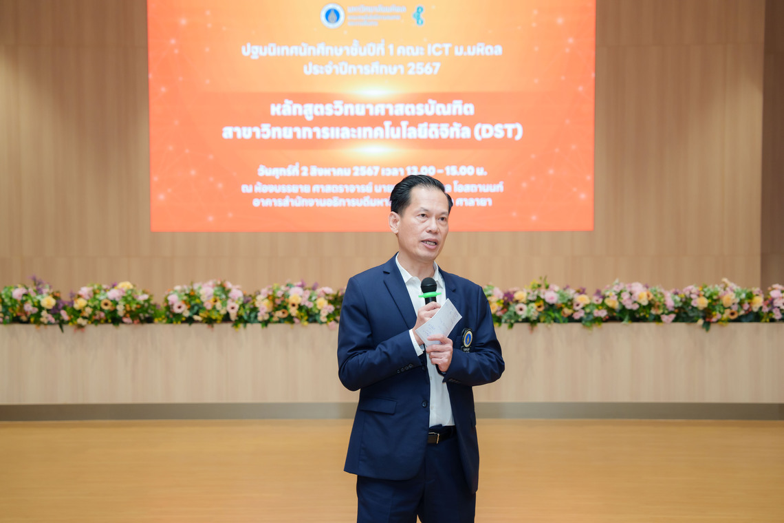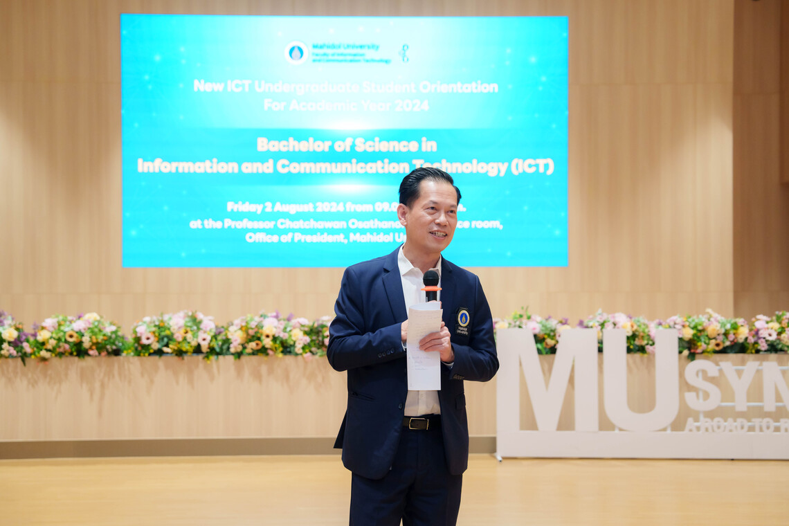 On August 2, 2024, the Faculty of Information and Communication Technology, Mahidol University (ICT Mahidol), held the “New Undergraduate Student Orientation for the Academic Year 2024 (ICT & DST Programs).” The morning session was for new students of the Bachelor of Science in Information and Communication Technology (ICT International Program), and the afternoon session was for new students of the Bachelor of Science in Digital Science and Technology (DST Thai Program). During this event, Dr. Pattanasak Mongkolwat, the Dean, delivered a heartfelt welcome speech and extended his best wishes, encouraging students to pursue their academic aspirations to become future IT professionals dedicated to serving the nation. The ceremony was held at the Professor Dr. Chatchawan Osathanon Lecture Room, Office of the President, Mahidol University, Salaya.