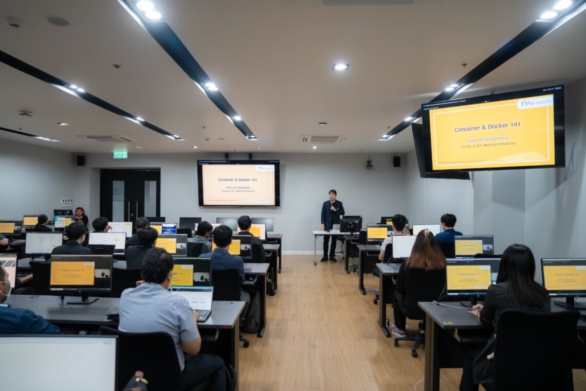 On November 27, 2025, Dr. Ittipon Rassameeroj, Assistant Dean for Infrastructure and Technology at the Faculty of Information and Communication Technology, Mahidol University (ICT Mahidol), was invited as a guest speaker at the “Containerize Everything” workshop for the Website Administrators and Developers Network across Mahidol University. The session was also supported by Mr. Angkun Napradit, Computer Technical Officer from the Technology Infrastructure Division, who served as an assistant speaker. The workshop was conducted in hybrid format, combining an on-site session at the Training Room of the Information Technology Division, Office of the President, Mahidol University, Salaya Campus, with a virtual session via Webex Meetings.