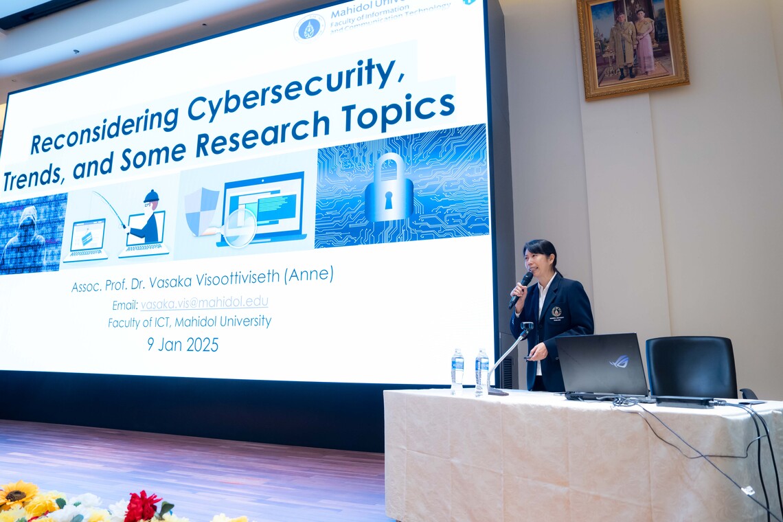 • “Reconsidering Cybersecurity, Trends, and Research Topics” by Assoc. Prof. Dr. Vasaka Visoottiviseth, addressing trends in cybercrime, modern social engineering attacks, and the use of AI in cybersecurity.