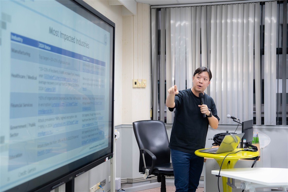 On August 1, 2025, the Faculty of Information and Communication Technology, Mahidol University (ICT Mahidol), organized the “Cybersecurity Training for ICT Staff: Security Awareness” program at Room IT210, 2nd Floor, ICT Building, Mahidol University, Salaya. The session was honored by Dr. Ittipon Rassameeroj, Assistant Dean for Infrastructure and Technology, who served as the keynote speaker, sharing his expertise in cybersecurity with the faculty’s staff.