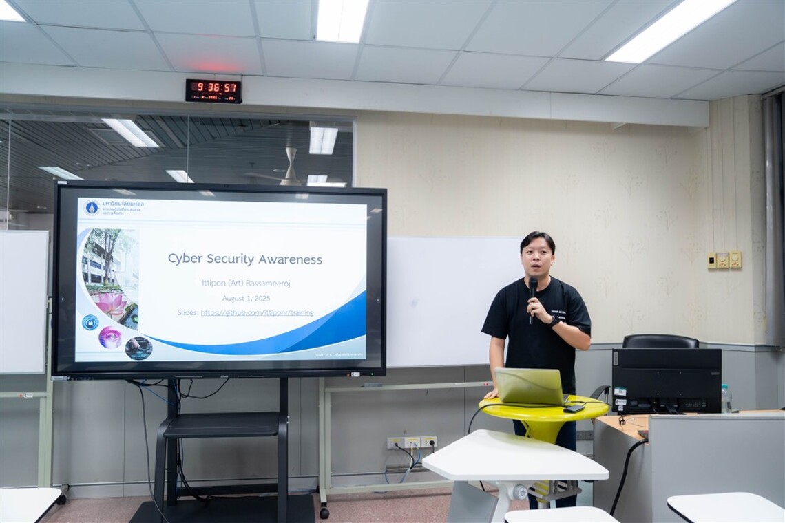 On August 1, 2025, the Faculty of Information and Communication Technology, Mahidol University (ICT Mahidol), organized the “Cybersecurity Training for ICT Staff: Security Awareness” program at Room IT210, 2nd Floor, ICT Building, Mahidol University, Salaya. The session was honored by Dr. Ittipon Rassameeroj, Assistant Dean for Infrastructure and Technology, who served as the keynote speaker, sharing his expertise in cybersecurity with the faculty’s staff.