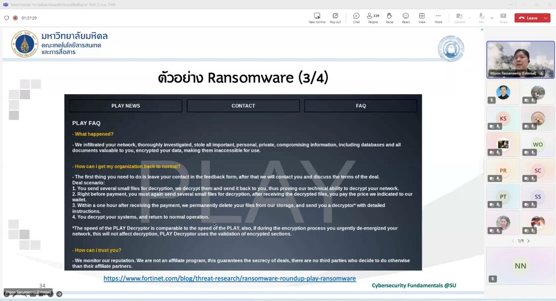On July 23, 2025, Dr. Ittipon Rassameeroj, Assistant Dean for Infrastructure and Technology, Faculty of Information and Communication Technology, Mahidol University (ICT Mahidol), was invited as a guest speaker for the online training program “Cybersecurity Fundamental”. The session was conducted via Microsoft Teams and attended by 417 staff members and students from Silpakorn University.