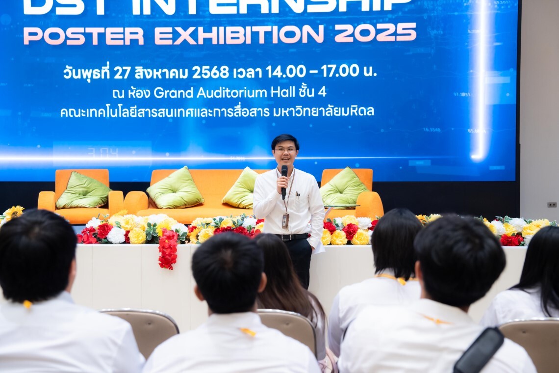 On August 27, 2025, the Faculty of Information and Communication Technology, Mahidol University (ICT Mahidol), organized the “DST Internship Exhibition 2025” for third-year students in the B.Sc. in Digital Science and Technology (DST Thai Program). On this occasion, Asst. Prof. Dr. Thanapon Noraset, Assistant Dean for Academic Affairs, delivered a warm welcome speech and outlined the event’s objectives to all participants at the Grand Auditorium Hall, 4th floor, ICT Building, Mahidol University, Salaya Campus.
