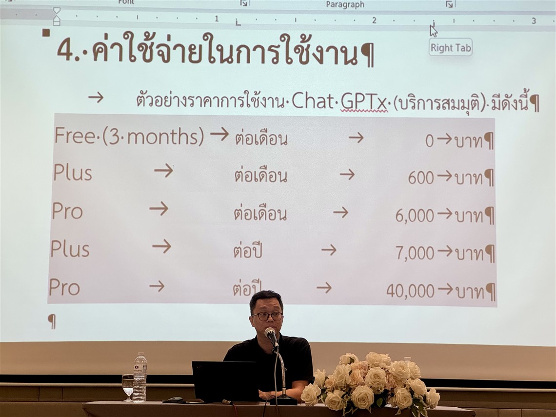 The workshop was honored by the presence of Asst. Prof. Dr. Tipajin Thaipisutikul, Assistant Dean for Academic Services and Technology Transfer; Miss Siriporn Rojanakosol, Assistant Dean for Information Technology; Dr. Sujika Srinuntakul, Assistant Dean for Quality Development and Knowledge Management; and Mr. Prach Chaisiri, Computer Technical Officer from the Information and Systems Division — all of whom served as instructors, sharing their expertise in using digital tools to enhance skills and improve work efficiency. The training was attended by 38 participants from various government agencies, and took place at TK Palace Hotel & Convention, Bangkok.