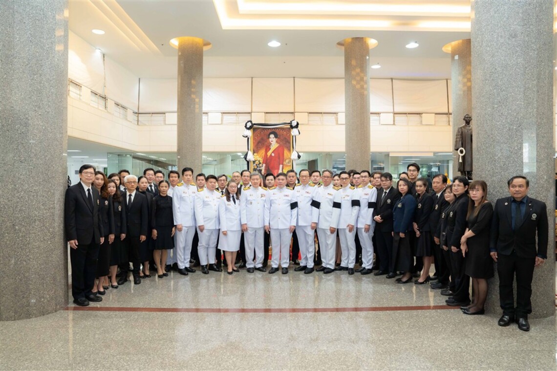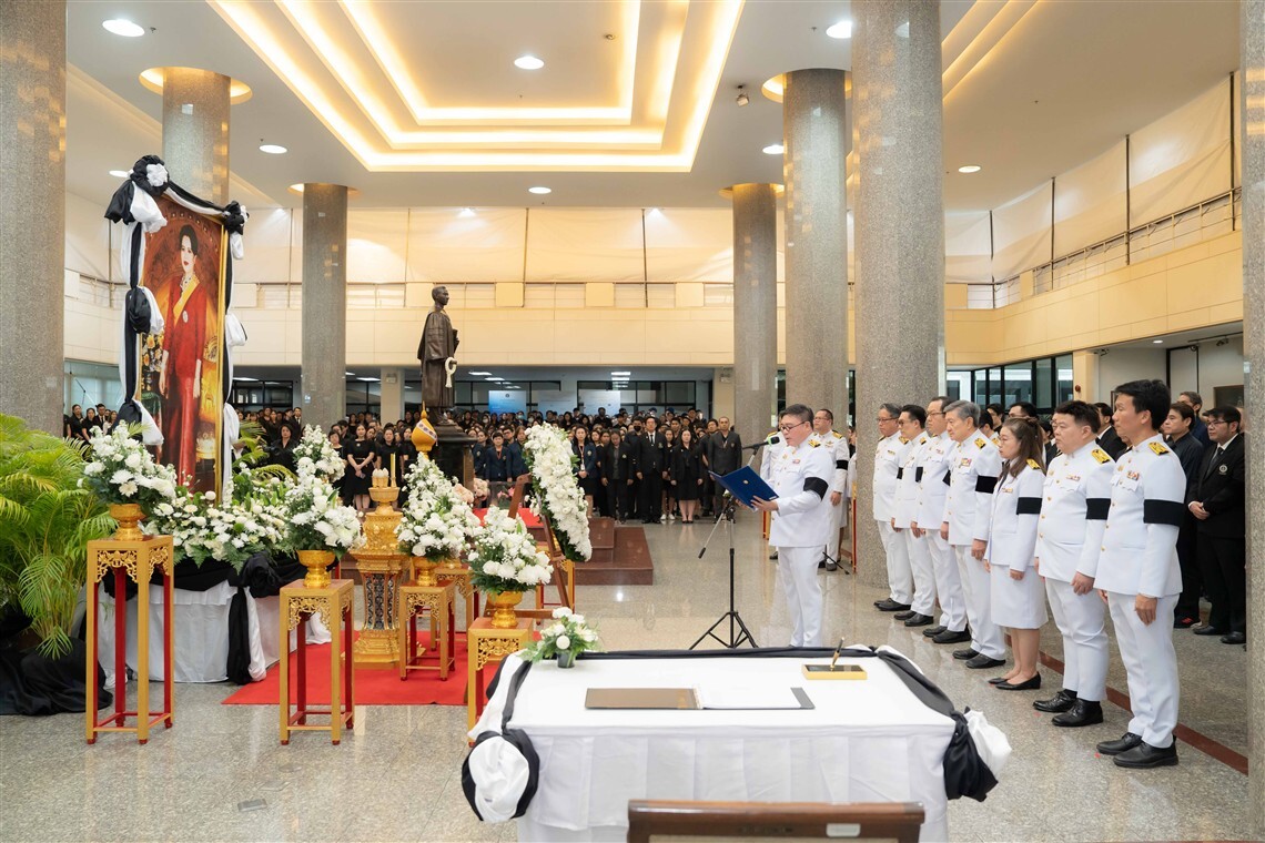 On this occasion, Assoc. Prof. Dr. Sittiwat Lertsiri, Vice President of Mahidol University, graciously presided over the ceremony—signing the book of condolences, presenting floral garlands, and laying wreaths before the royal portrait—and subsequently led the attendees in a moment of silent tribute to honor the benevolence of Her Majesty Queen Sirikit The Queen Mother at the Office of the President’s Hallway, 1st Floor, Mahidol University, Salaya Campus.