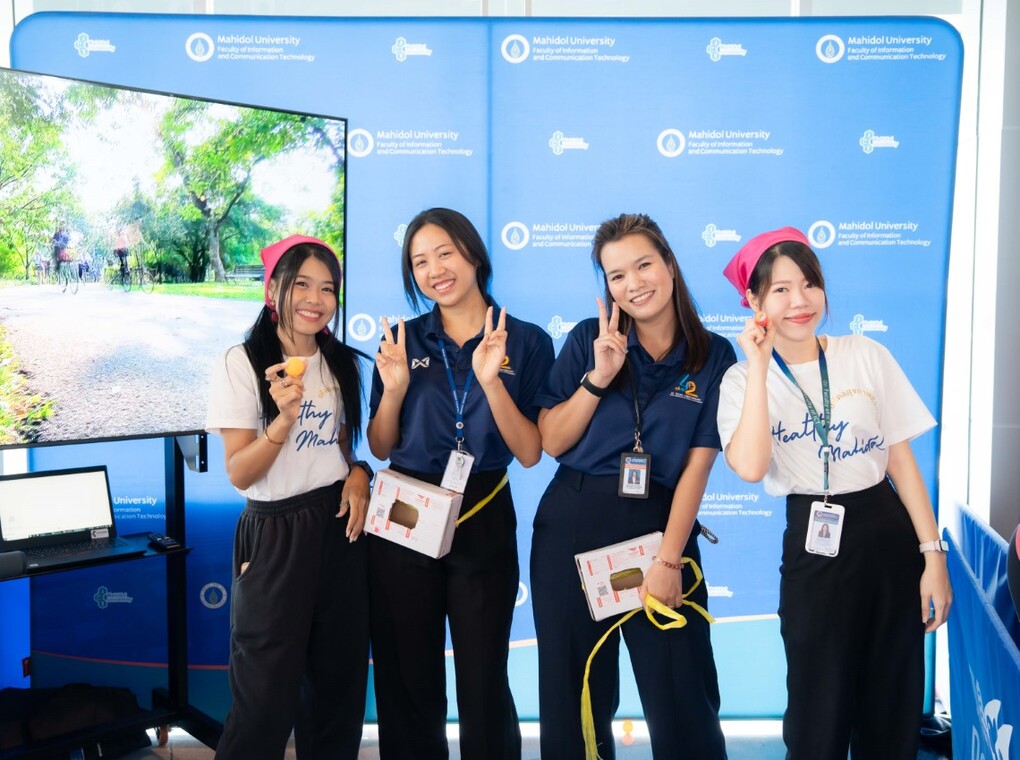 On September 17, 2025, Dr. Petch Sajjacholapunt, Deputy Dean for Administration and Human Resource at the Faculty of ICT, Mahidol University (ICT Mahidol), in his capacity as a member of the Sub-Working Group Committee of MU Health Promotion at Mahidol University, together with Dr. Pawitra Liamruk, Deputy Dean for Organizational Development and Special Affairs, along with the Happiness-Enhancing Working Group of ICT Mahidol, organized a booth titled “ICT 001 : The Shaking Belt Survival” in the “Health Booth Zone” at the “Healthy University Day – HEALTHY MAHIDOL in the New Normal 2025” event. The event was held at Prince Mahidol Hall, Mahidol University, Salaya Campus.