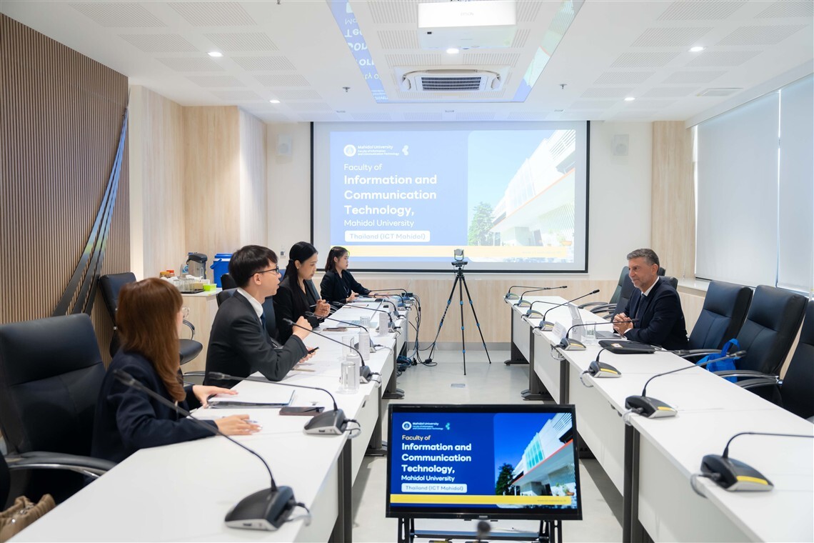 On November 26, 2025, Dr. Pisit Praiwattana, Assistant Dean for Organizational Communications and Media Technology, Faculty of Information and Communication Technology, Mahidol University (ICT Mahidol), as the Dean’s representative, together with Ms. Wanpimon Senapadpakorn, Director of the Global Partnerships Division, Mahidol University, welcomed and held a meeting to discuss academic collaboration with Dr. Paulo Zagalo-Melo, Senior Internationalization Strategist from Virginia Commonwealth University (VCU), USA, at Meeting Room 415, 4th floor, Office of the President, Mahidol University, Salaya Campus. The objective of the meeting was to discuss potential academic cooperation in areas such as joint curriculum development, student exchanges for high-potential students to gain learning and research experience in the research laboratories of both institutions, and the implementation of Student Mobility Programs.