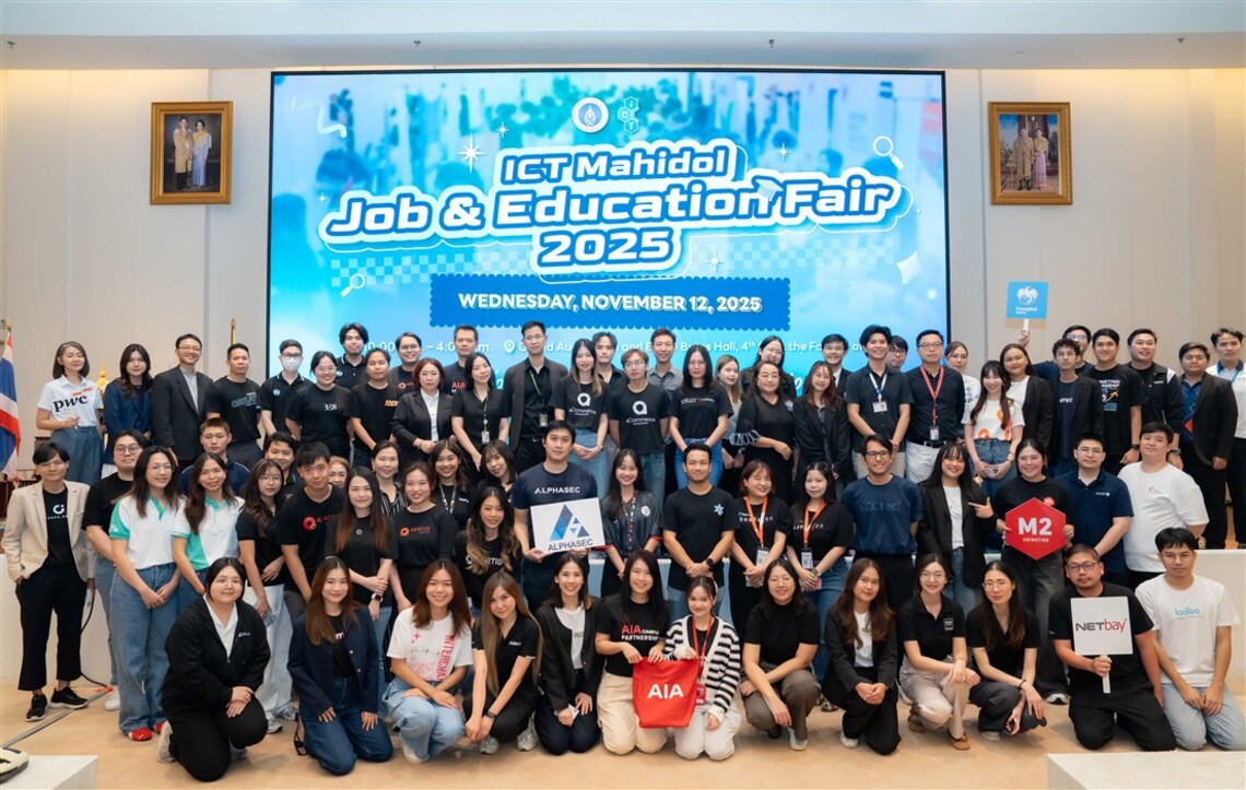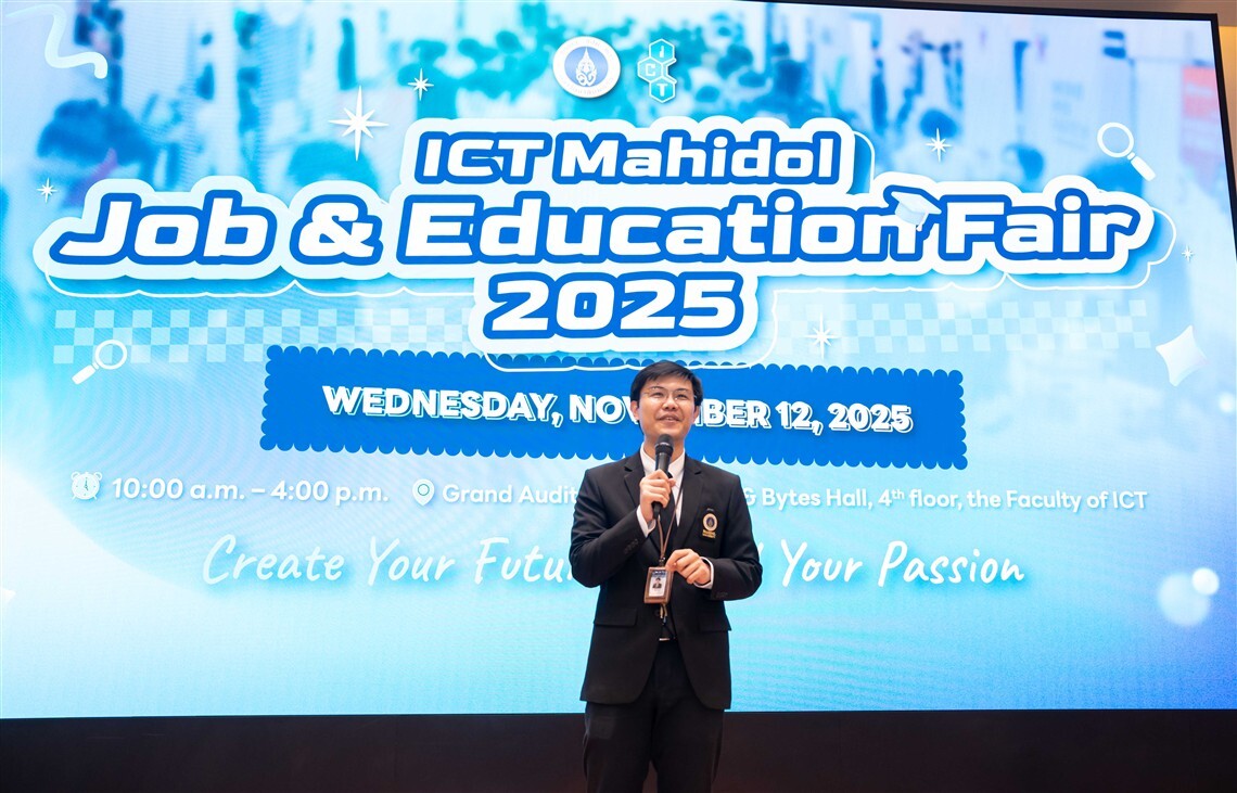 On November 12, 2025, the Faculty of Information and Communication Technology, Mahidol University (ICT Mahidol), hosted the “ICT Mahidol Job & Education Fair 2025” at the Grand Auditorium and Bits & Bytes Hall, Faculty of ICT, Mahidol University, Salaya Campus. On this occasion, Assistant Professor Dr. Thanapon Noraset, Assistant Dean for Academic Affairs, represented the Dean and delivered a warm welcome speech to all company representatives and students. Moreover, he expressed gratitude to the participating companies and international educational institutions for their valuable contributions in providing career opportunities and guidance on further studies for the students.