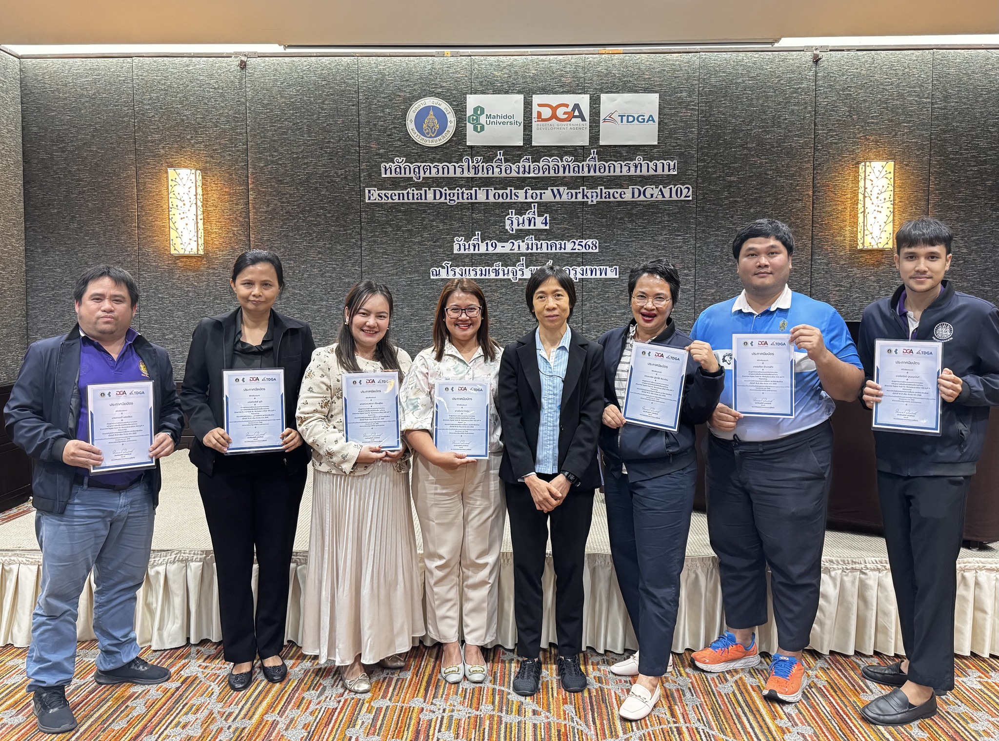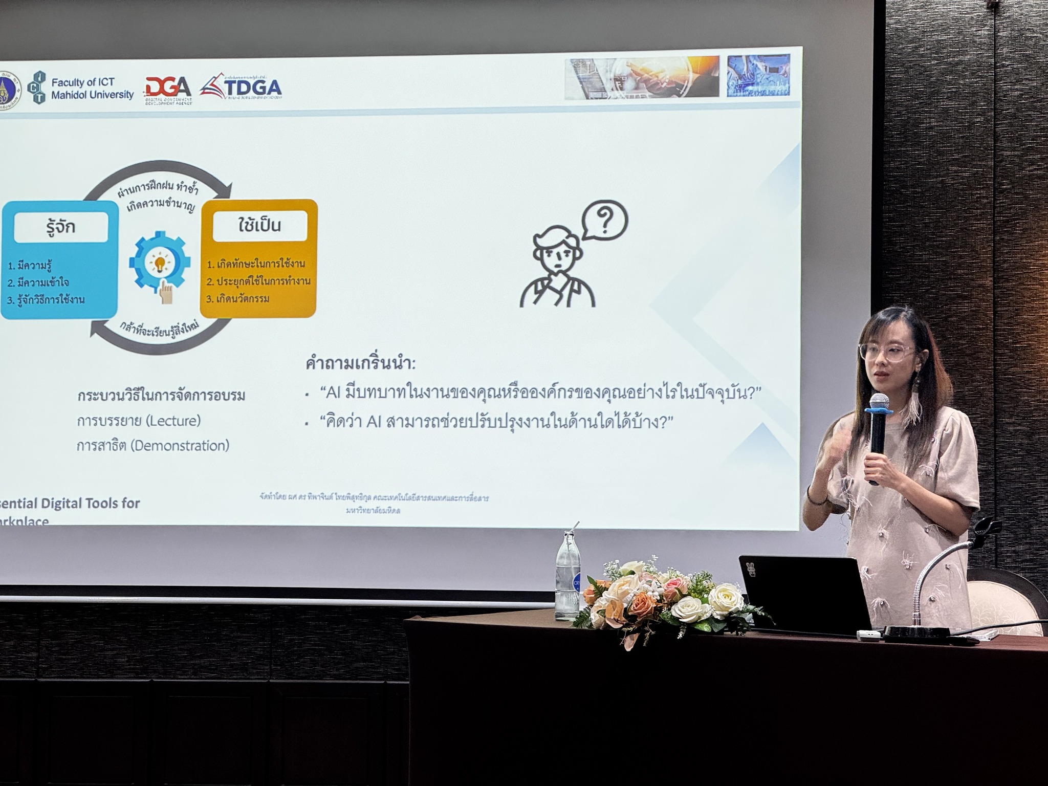 From March 19 to 21, 2025, the Faculty of Information and Communication Technology, Mahidol University (ICT Mahidol), in collaboration with the Thailand Digital Government Academy (TDGA), hosted the workshop on “Essential Digital Tools for Workplace (DGA102), Batch 4.” On this occasion, Asst. Prof. Dr. Tipajin Thaipisutikul, Assistant Dean for Academic Services and Technology Transfer; Miss Siriporn Rojanakosol, Assistant Dean for Information Technology; Dr. Sujika Srinuntakul, Educator, Audio-Visual Technical Officer from Audio Visual and Digital Learning Media Development Department; and Mr. Prach Chaisiri, Computer Technical Officer from Information and Systems Department, served as guest speakers. They shared their expertise on utilizing various digital tools to enhance skills and workplace efficiency for 35 government personnel at Century Park Hotel, Bangkok.