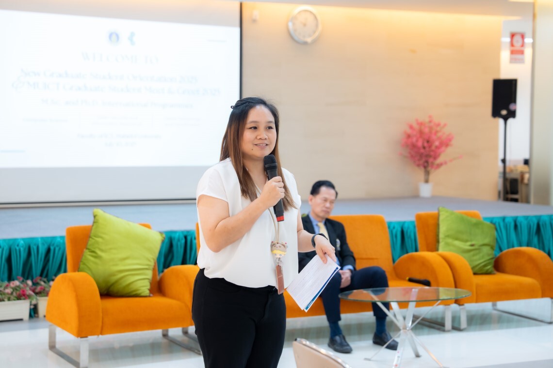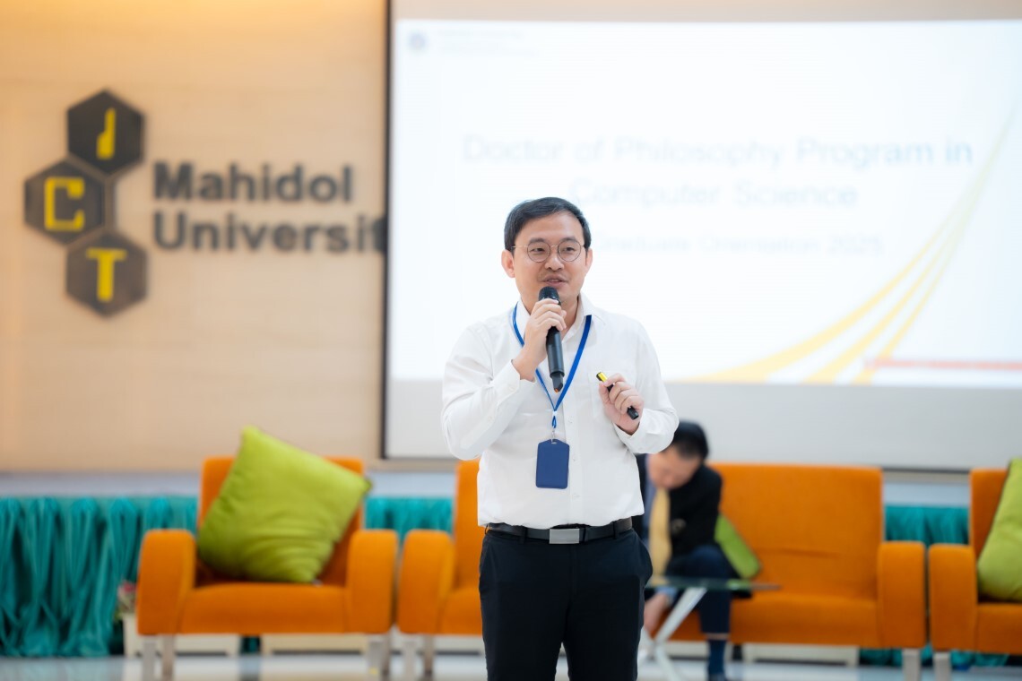 On July 30, 2025, the Faculty of Information and Communication Technology, Mahidol University (ICT Mahidol), organized an orientation for new graduate students for the academic year 2025 from the Doctor of Philosophy in Computer Science Program, as well as the Master of Science Programs in Computer Science, Cyber Security and Information Assurance, and Game Technology and Gamification. The orientation was presided over by Dr. Pattanasak Mongkolwat, Dean of ICT Mahidol, who delivered a warm welcome speech to the new students. The orientation also featured a presentation by Asst. Prof. Dr. Jidapa Kraisangka, Assistant Dean for Academic and Curriculum Development, who provided an overview of the graduate programs. The event was held at Bits & Bytes Hall, 4th Floor, ICT Building, Mahidol University, Salaya Campus, and was also accessible online via Webex Meetings.
