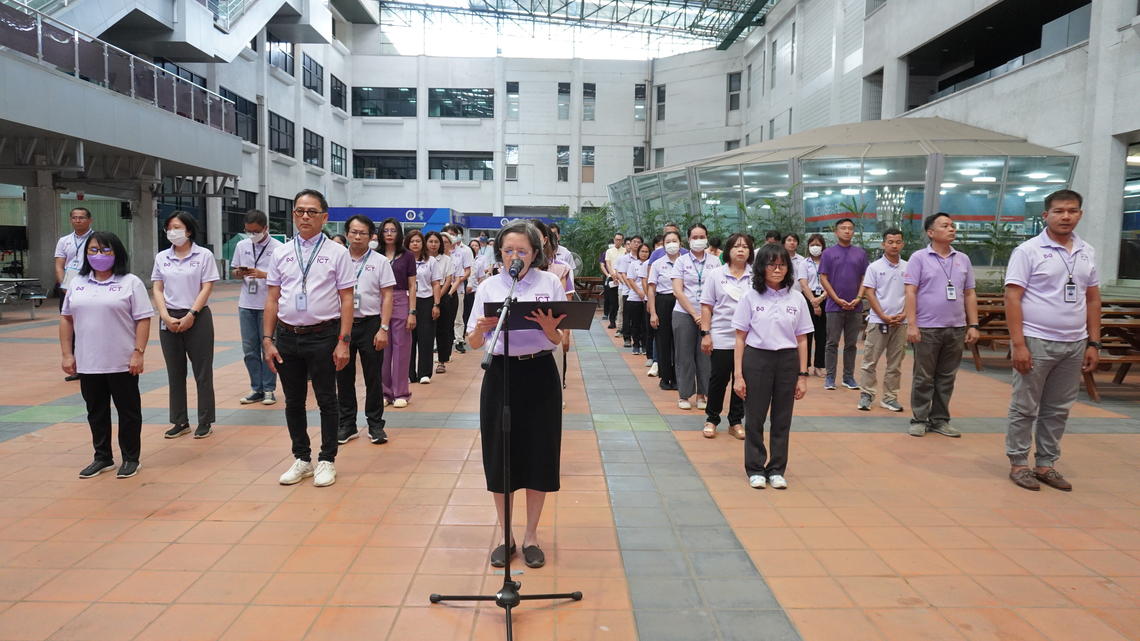 On the same occasion, the Faculty of ICT also held the “Celebration Ceremony on the Auspicious Occasion of Her Majesty Queen Suthida Bajrasudhabimalalakshana’s 46th Birthday,” presided over by Asst. Prof. Dr. Sukanya Phongsuphap. ICT Mahidol’s executive team, instructors, and staff, dressed in purple-toned attire, attended the ceremony.