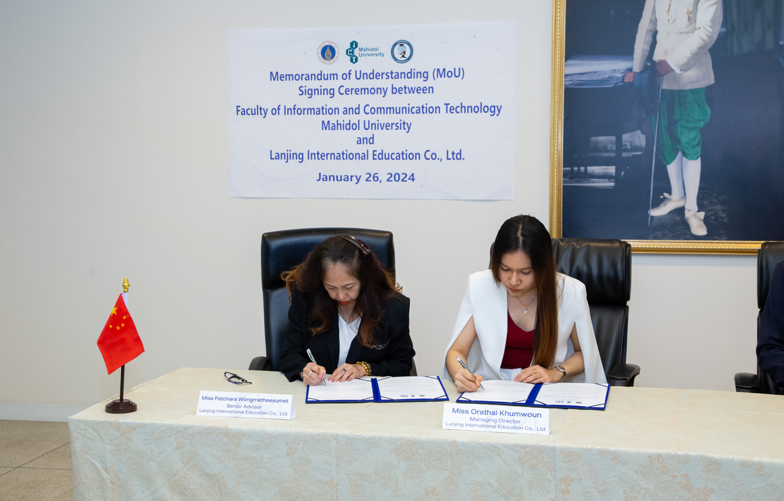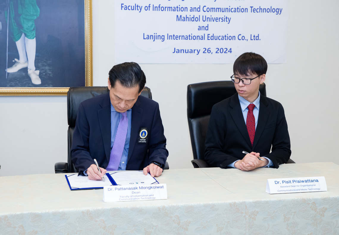 On January 26, 2024 – Dr. Pattanasak Mongkolwat, the Dean of the Faculty of Information and Communication Technology, Mahidol University (ICT Mahidol), and Miss Orathai Khumwoun, Managing Director, Lanjing International Education Co., Ltd., the People’s Republic of China, signed a Memorandum of Understanding (MoU).  On this occasion, Dr. Pisit Praiwattana, Assistant Dean for Organizational Communications and Media Technology, ICT Mahidol, as well as Miss Patchara Wongmetheesumet (Senior Advisor), Mr. Nuttiwut Pratum (Assistant Manager), as well as Miss Parinchon Saeyang (Coordinator & Interpreter) from Lanjing International Education Co., Ltd., joined as witnesses at Room IT404, 4th floor, ICT Building, Salaya.