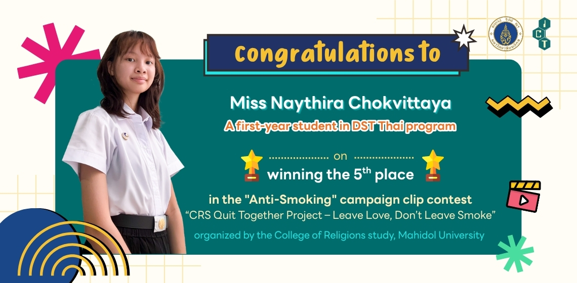 The Faculty of Information and Communication Technology, Mahidol University (ICT Mahidol), would like to extend its heartfelt congratulations to Miss Naythira Chokvittaya, a first-year student in the Bachelor of Science in Digital Science and Technology (DST Thai Program), for winning Fifth Place in the “Anti-Smoking Campaign Video Contest”, organized under the project titled “CRS Quit Together – Share Love, Not Smoke.” The award results were officially announced on 22 July 2025.