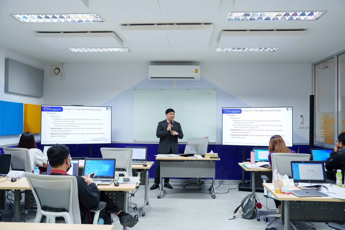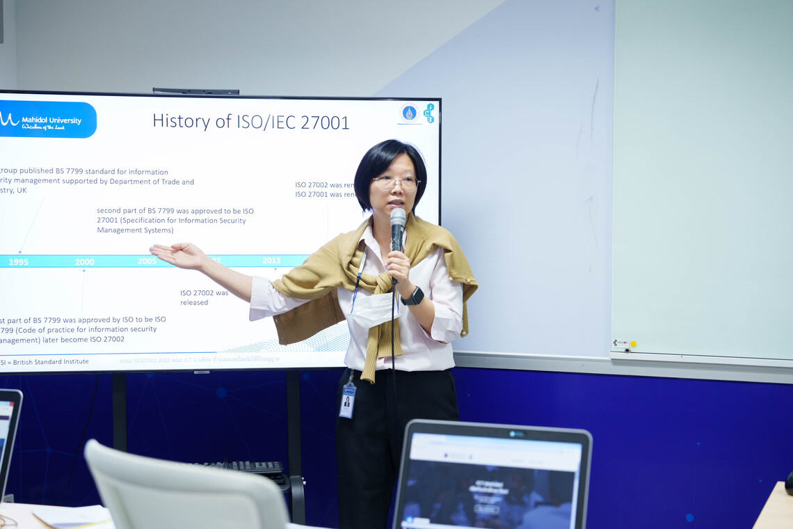 On June 6-7, 2024, the Faculty of Information and Communication Technology, Mahidol University (ICT Mahidol), organized a workshop on the “Information Security Management with ISO 27001: 2022.” On this occasion, Dr. Assadarat Khurat, Assistant Dean for Risk Management and Cybersecurity, together with Dr. Wudhichart Sawangphol, Assistant Dean for Research, and Asst. Prof. Dr. Thanwadee Sunetnanta, Instructor of the Computer Science Group and Software Engineering and Business Analytics Research Clusters (SEBA), served as the speakers. They shared knowledge about the ISO/IEC 27001:2022 and ISO/IEC 27002:2022 standards, which are the latest international standards for Information Security Management Systems (ISMS), updated in 2022, with participants in Room A2, 1st floor, ICT Building, Mahidol University, Salaya.