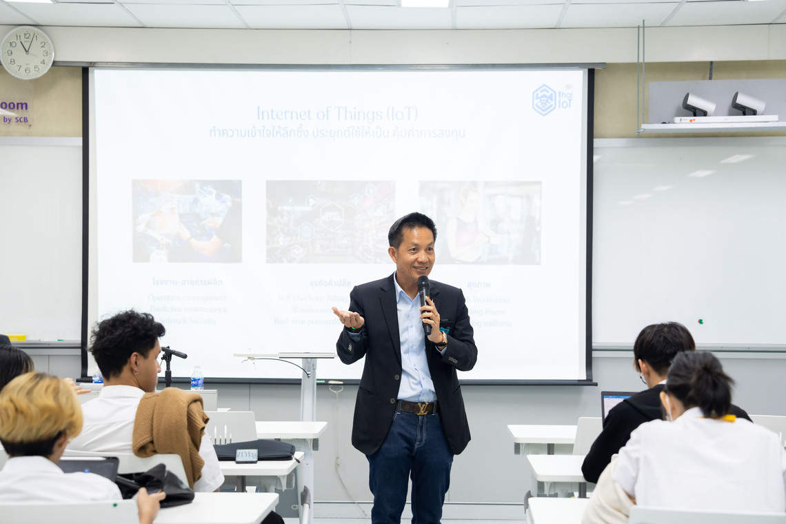 On this occasion, Dr. Suthat Krongchon, President of the Thai IoT Association, served as the guest speaker. He shared insights into the Internet of Things (IoT) and his professional experience in the field with first-year students in the B.Sc. in Digital Science and Technology (DST Thai Program) at Room IT204, 2nd Floor, ICT Building, Salaya.