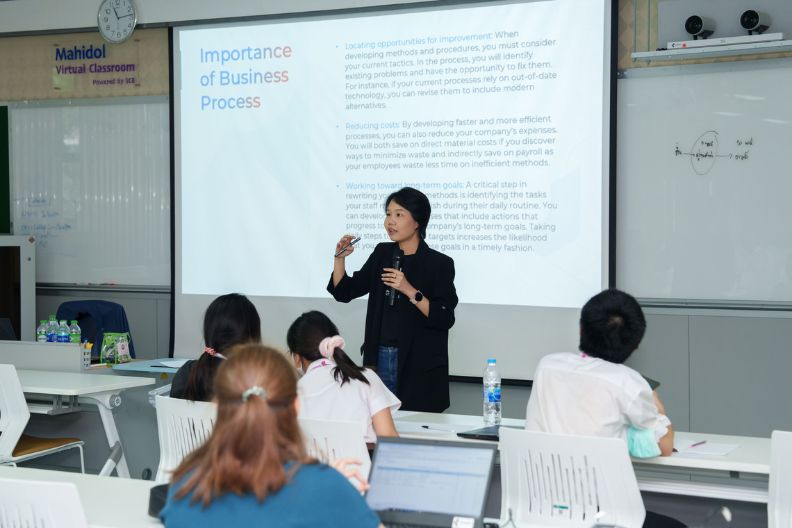 On February 7, 2024 – the Faculty of Information and Communication Technology, Mahidol University (ICT Mahidol), led by Assoc. Prof. Dr. Sudsanguan Ngamsuriyaroj, Advisor to the Dean, and Dr. Tipajin Thaipisutikul, Assistant Dean for Academic Services and Technology Transfer, who are instructors of the course ITDS201 Industry Problems and Experiences 2, organized a special talk on “Business Process Workshop” for the 2nd year students of B.Sc. in Digital Science and Technology (DST Thai Program). On this occasion, Mr. Panya Pornkajornkitkul, Managing Director, as well as Ms. Suporanee Sombathawee, Business Unit Manager, Bluebik Vulcan Company Limited, served as the guest speakers in Room IT204 the Faculty of ICT, Mahidol, Salaya.