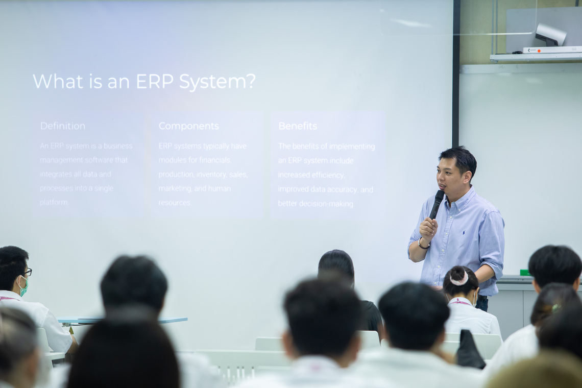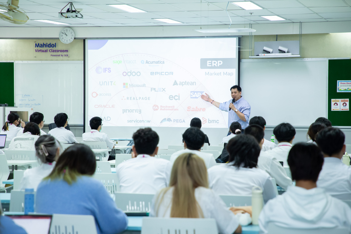 On January 17, 2024 – the Faculty of Information and Communication Technology, Mahidol University (ICT Mahidol), led by Assoc. Prof. Dr. Sudsanguan Ngamsuriyaroj, Advisor to the Dean, and Dr. Tipajin Thaipisutikul, Assistant Dean for Academic Services and Technology Transfer, who are instructors of the course ITDS201 Industry Problems and Experiences 2, organized a special talk on “WHAT IS ERP? AND WHY WE NEED ONE?” for the 2nd year students of B. Sc. in Digital Science and Technology (DST Thai Program). On this occasion, Mr. Jirawat Eauchai (ICT Alumnus #2), Co-Founder and Chief Operating Officer of Trinity Roots Co., Ltd., served as the guest speaker. He conveyed knowledge about tools to enhance efficiency in Enterprise Resource Planning (ERP) businesses to all the students in Room IT204, the Faculty of ICT, Mahidol University, Salaya.